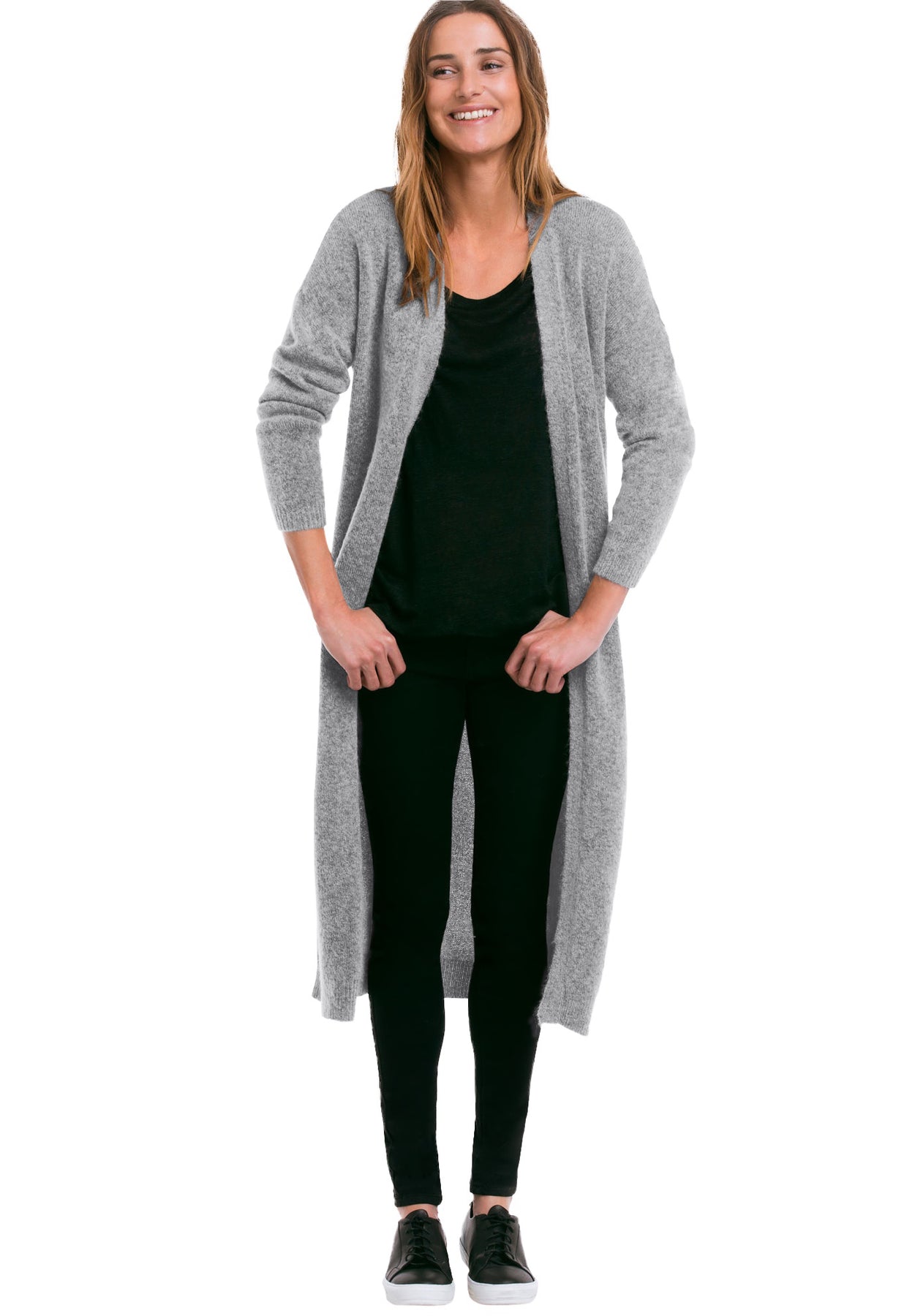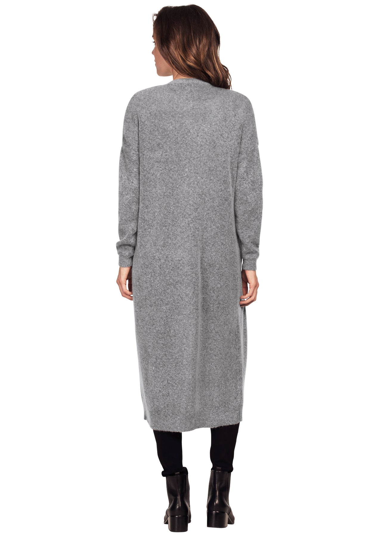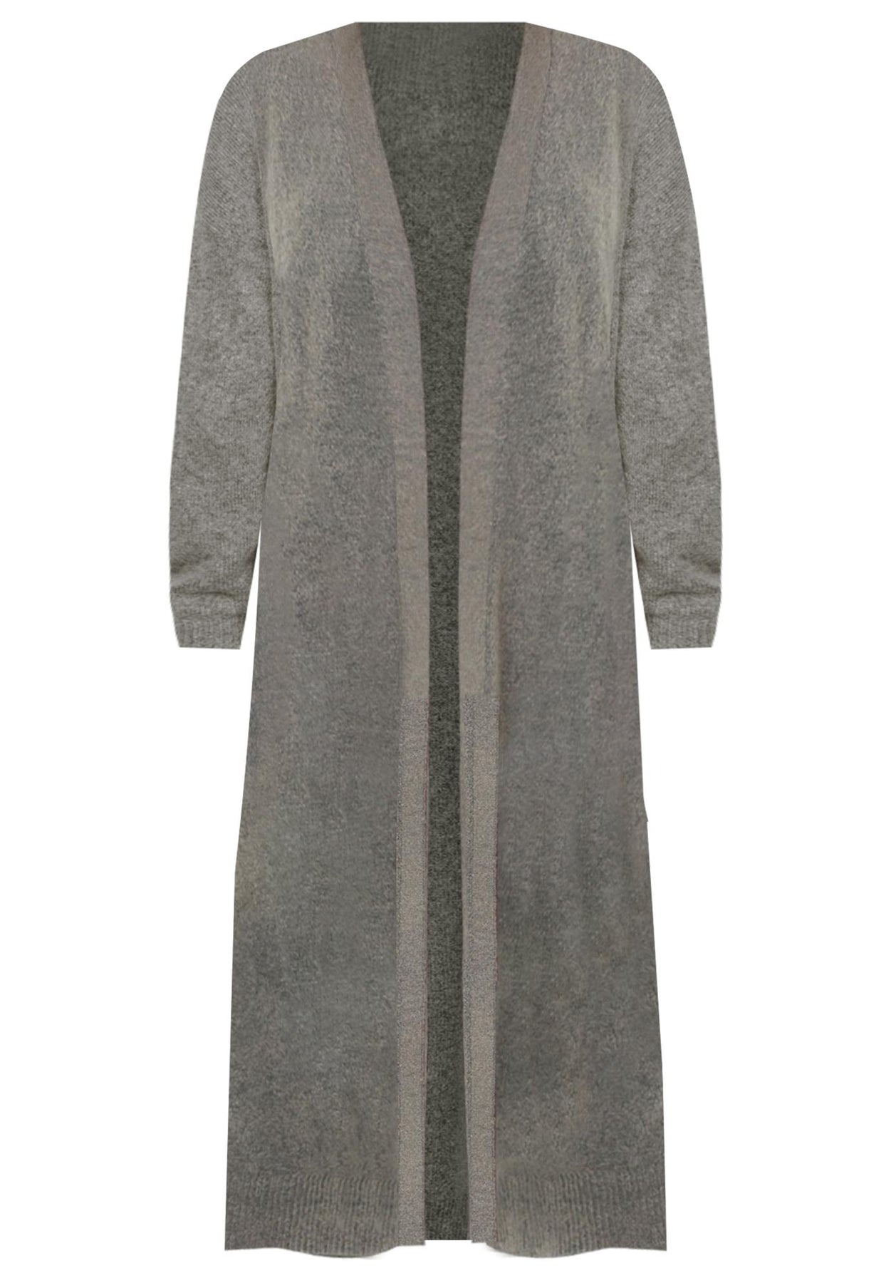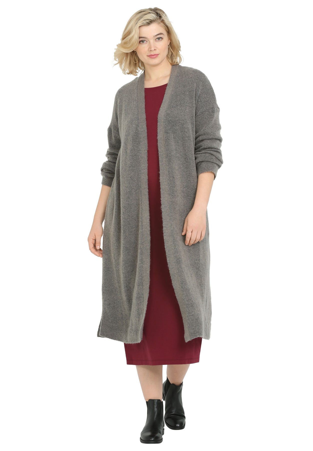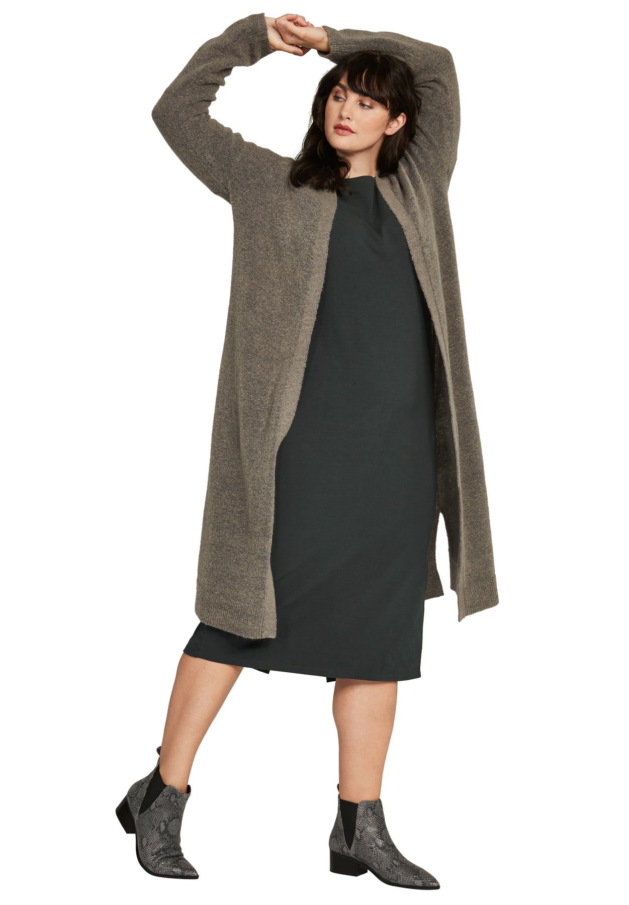 Sweater duster with open front. V-neck. Long sleeves with dropped shoulders. Ribbed sleeve cuffs and straight bottom hem.
