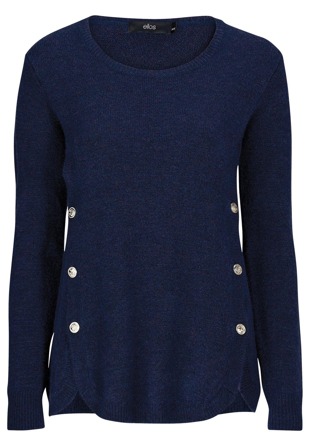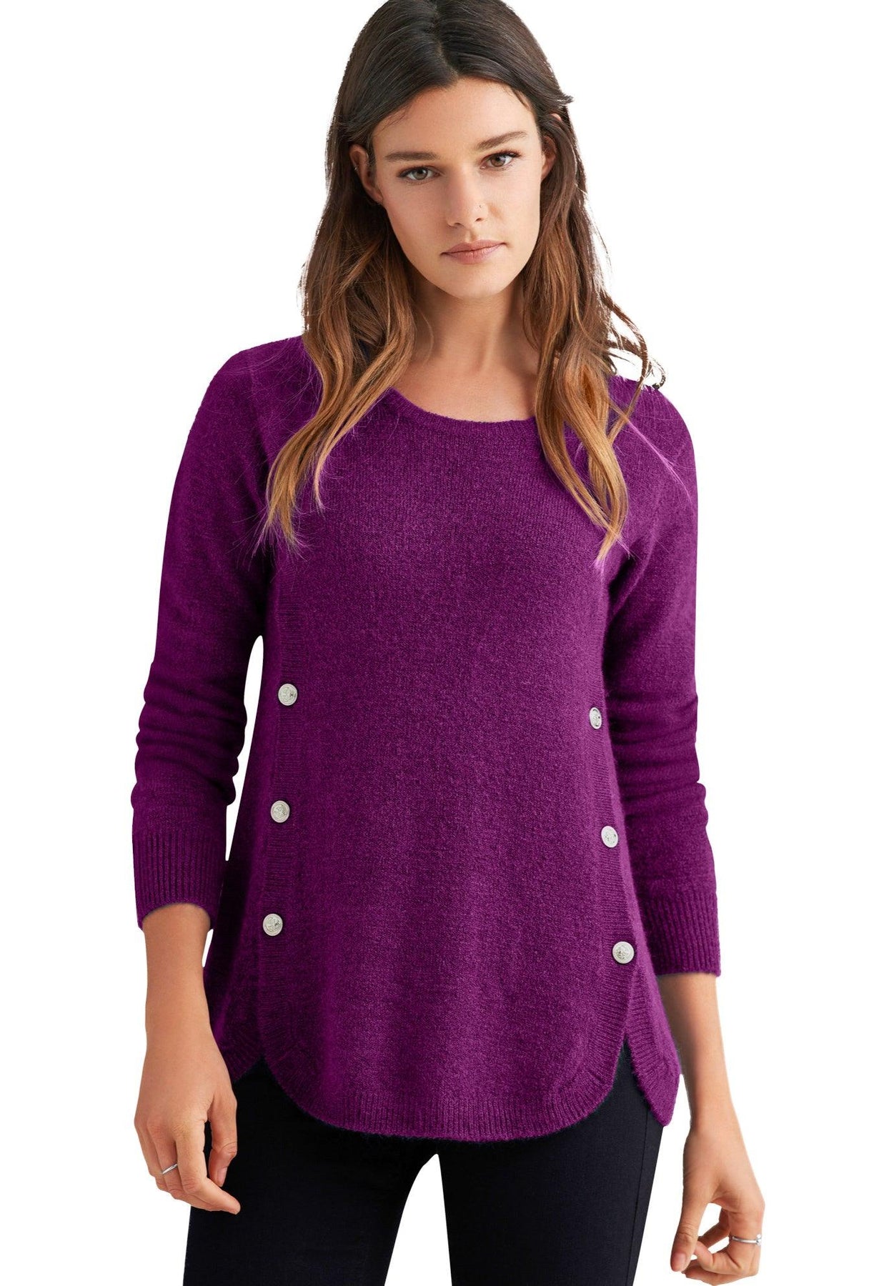 It's the little modern details - Silver buttons on the sides of this ribbed trim sweater make it a must-have.