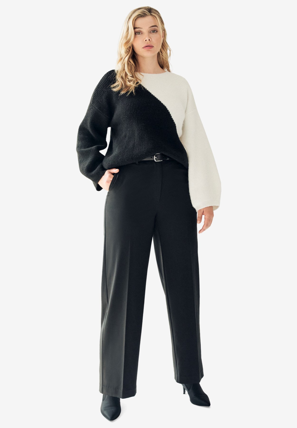 A diagonal colorblock in classic black and white gives this sweater a bold look. The ballet neckline is flattering on every body. It dresses up nicely with slacks and gives jeans a style boost.