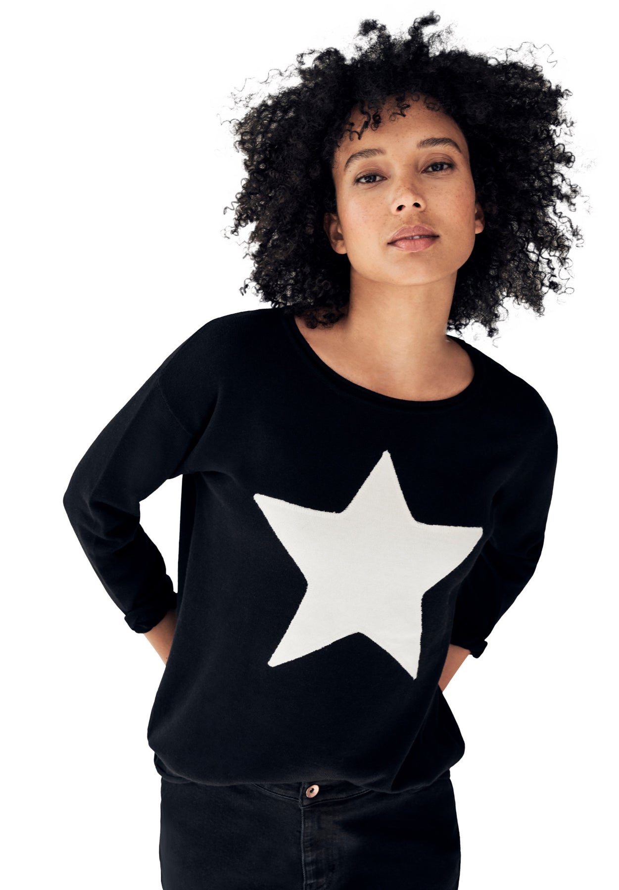 Star applique at front. Scoop neck. Long sleeves with drop shoulders. Decorative rolled edges at neckline, sleeve cuffs, hem.