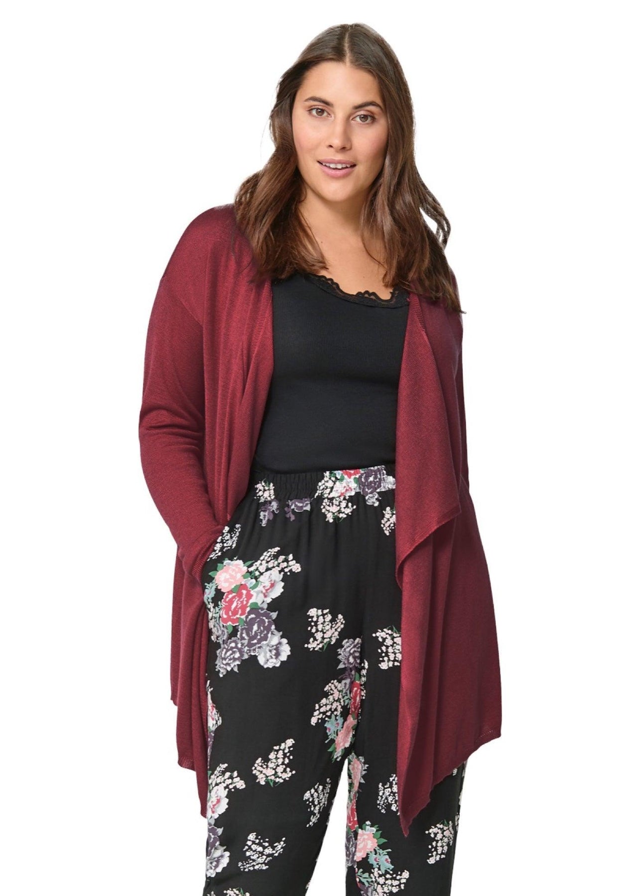 Lightweight cardigan has an open drape front. Long sleeves with drop shoulders. Ribbed hem.
