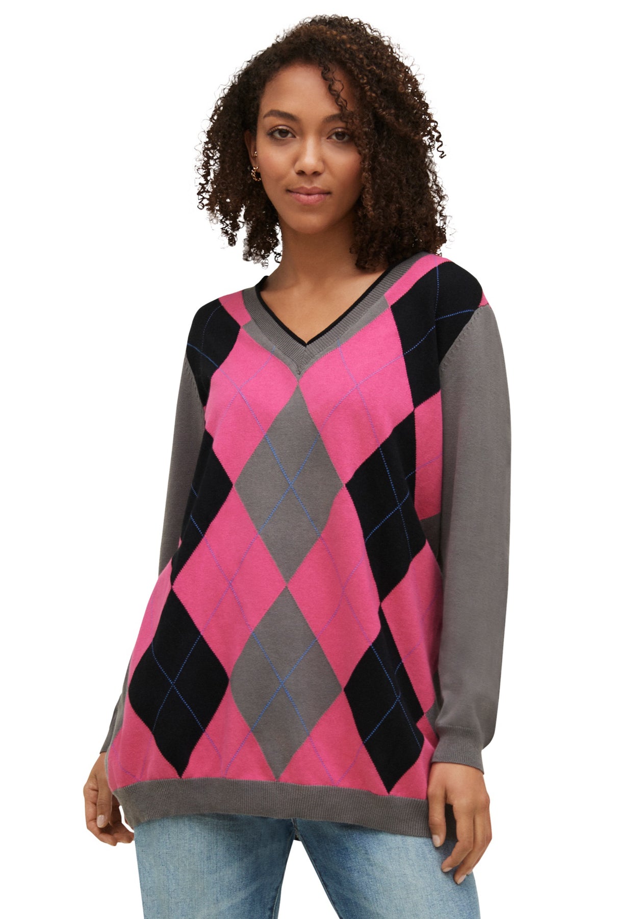 Argyle pattern on front. V-neckline with roll detail. Long sleeves.