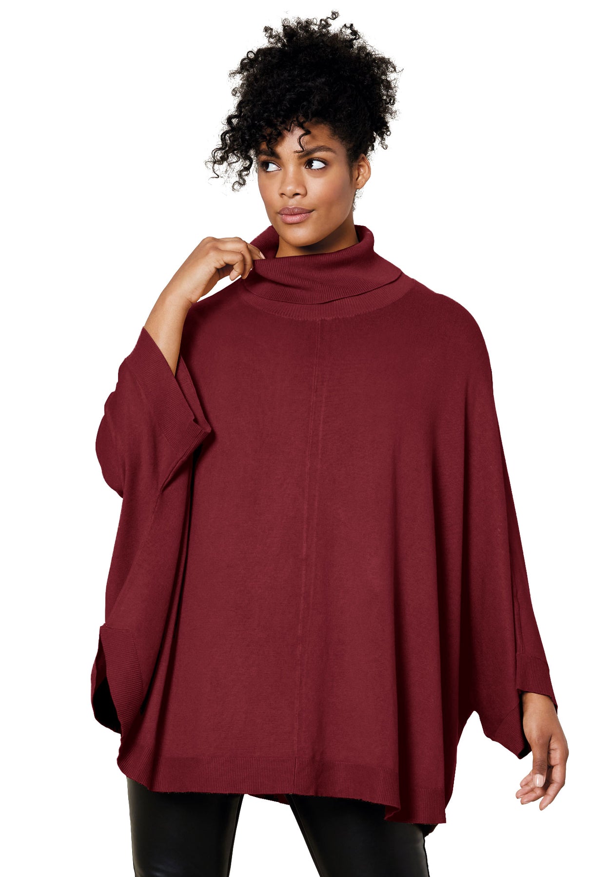 Oversized poncho sweater with ribbed foldover turtleneck. Ribbing at sleeve cuffs and slightly rounded hem.