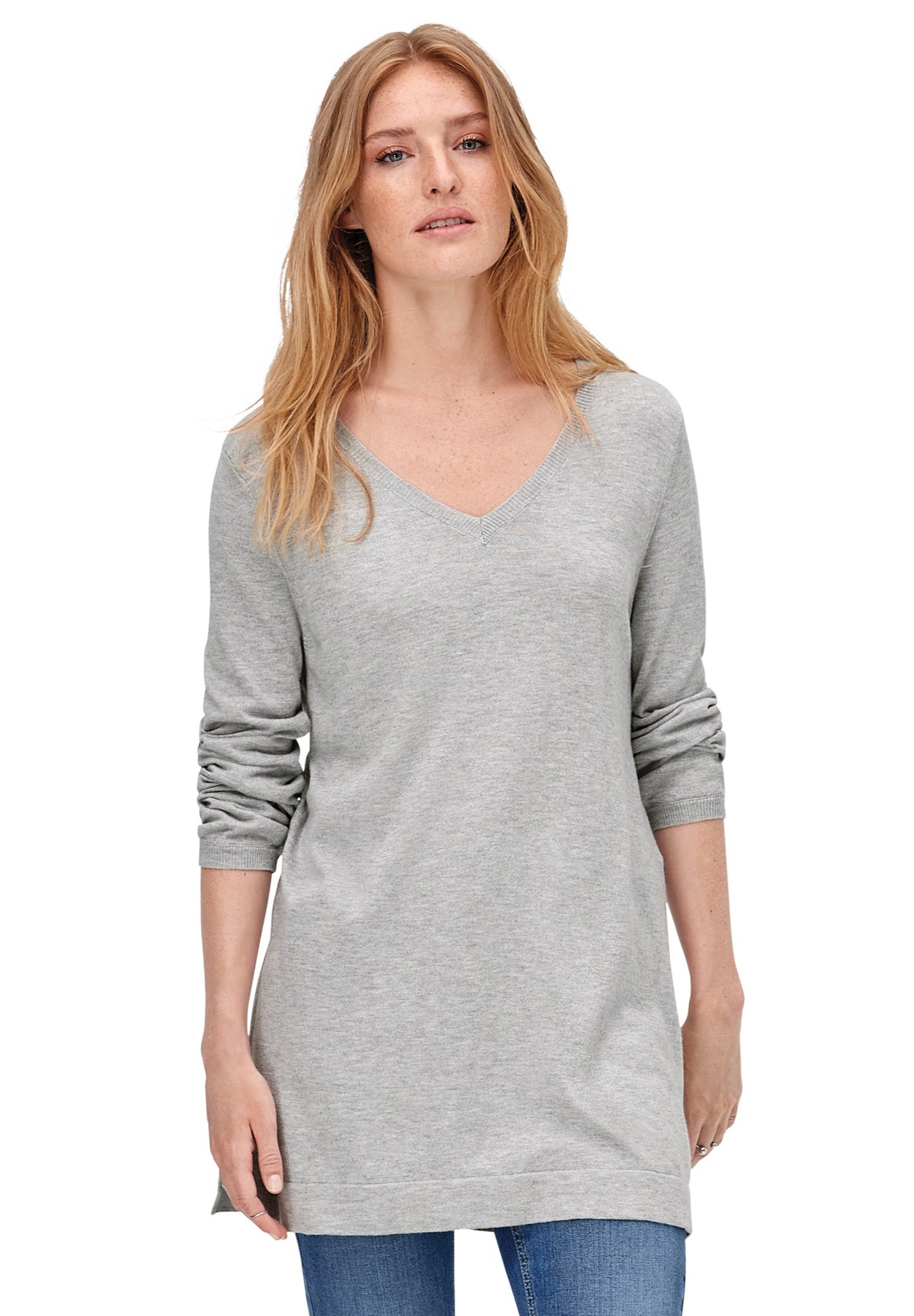 Fit I exchanged for one size up because I like my sweaters a little slouchy and loose around the belly so they dont cling when I sit down Slightly longer than it looks in picture Ellos seems to measure length on body from shoulder Im 56 with a long body and it covers the top 3rd of my thighs