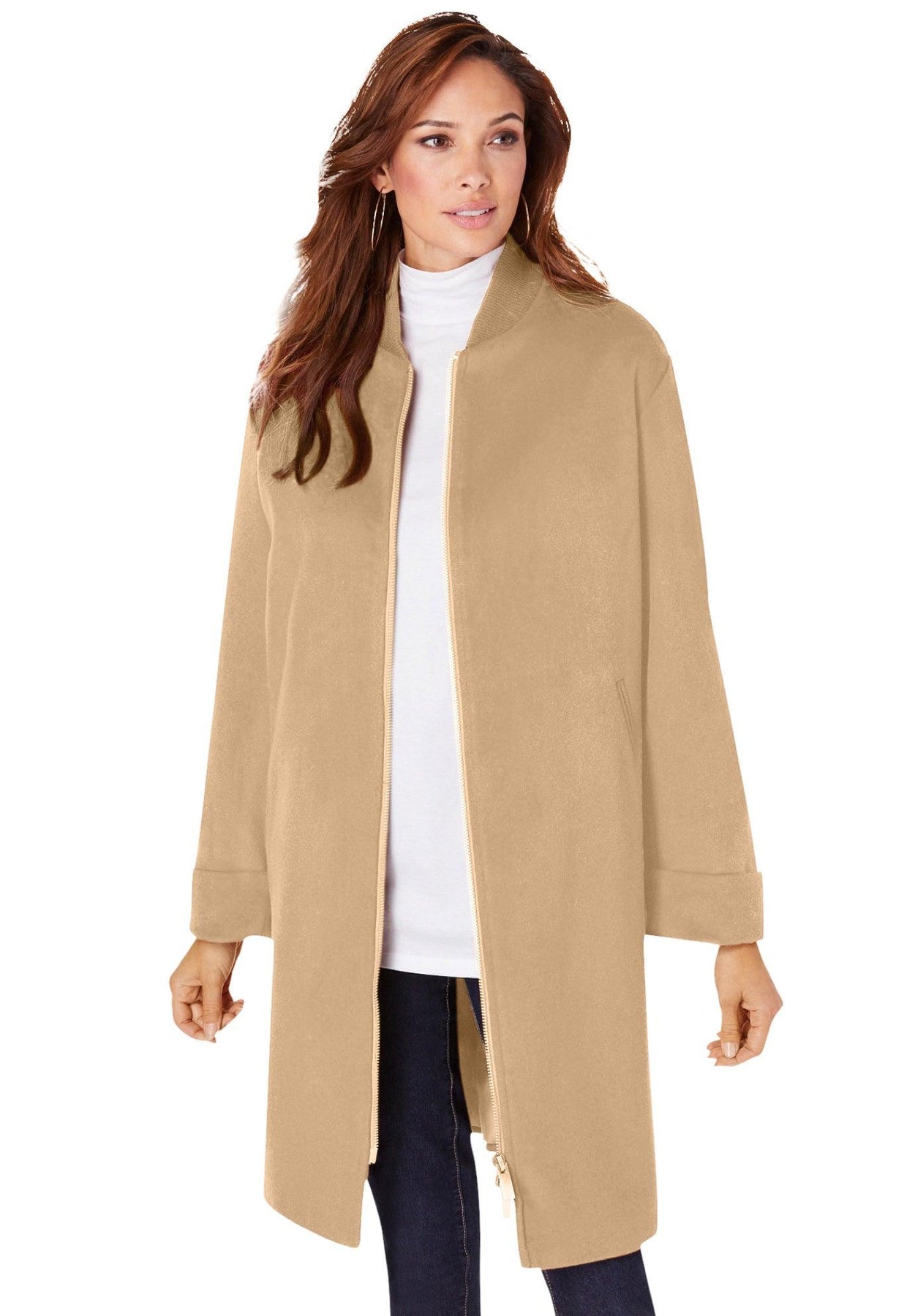 The fashionable silhouette you need for an elegant outerwear look. This sleek driving coat is shaped to have extra room while looking stylish with a sporty rib collar, two-way zip front and drop shoulders. Side pockets and side slits at hem.