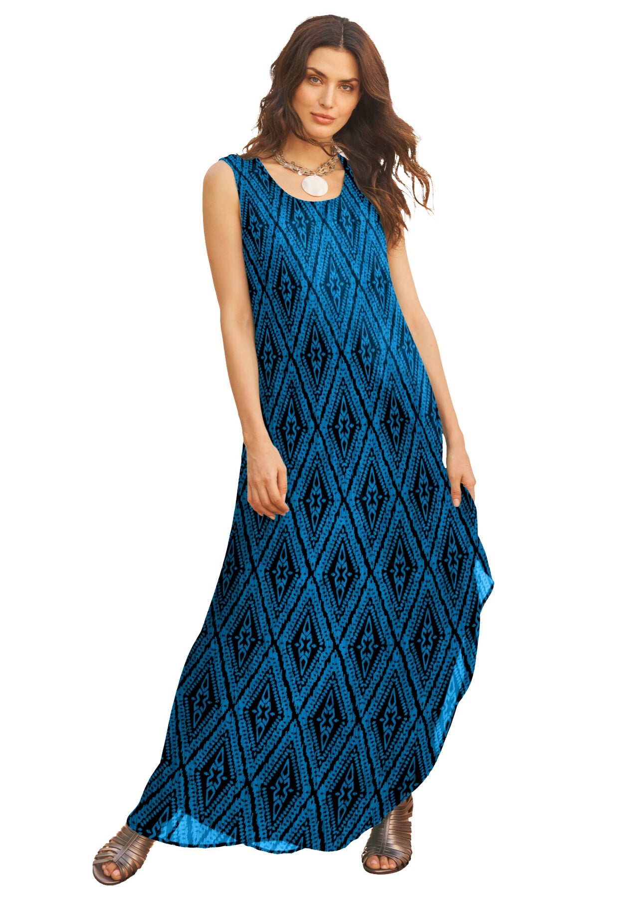 Get ready to own the room in this sweeping sleeveless dress in favorite crinkle fabric. Princess seams and an A-line silhouette make for an unbelievably flattering shape. Pullover style and scoop neckline.