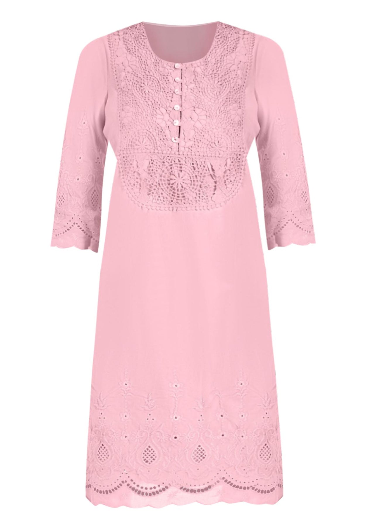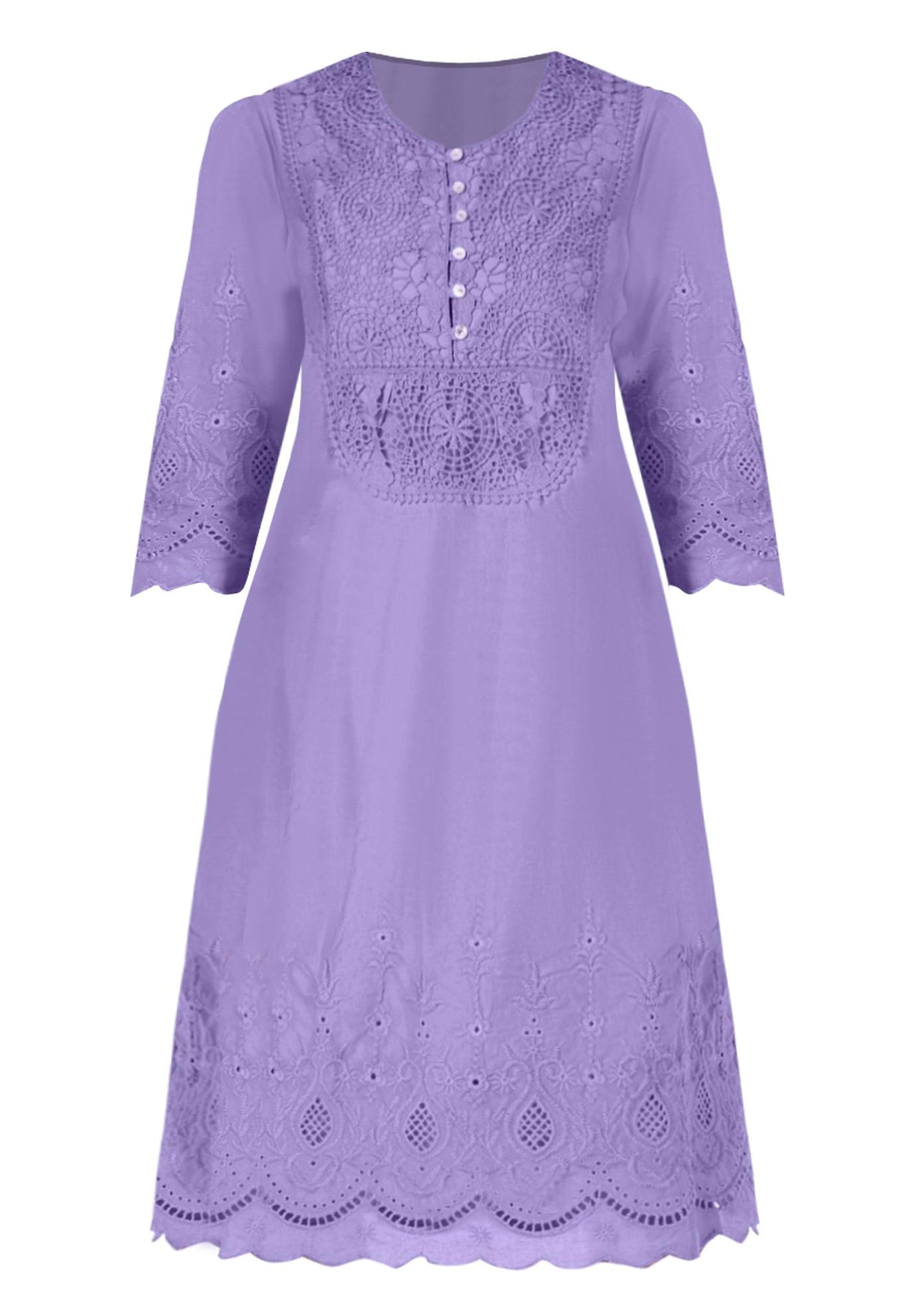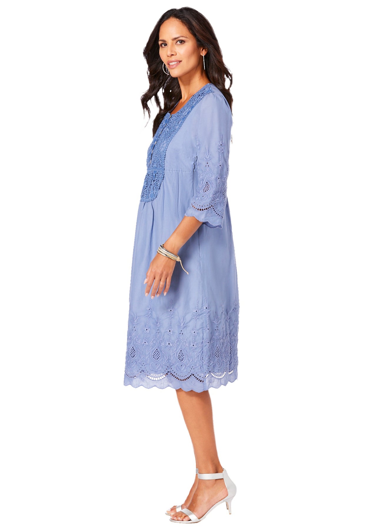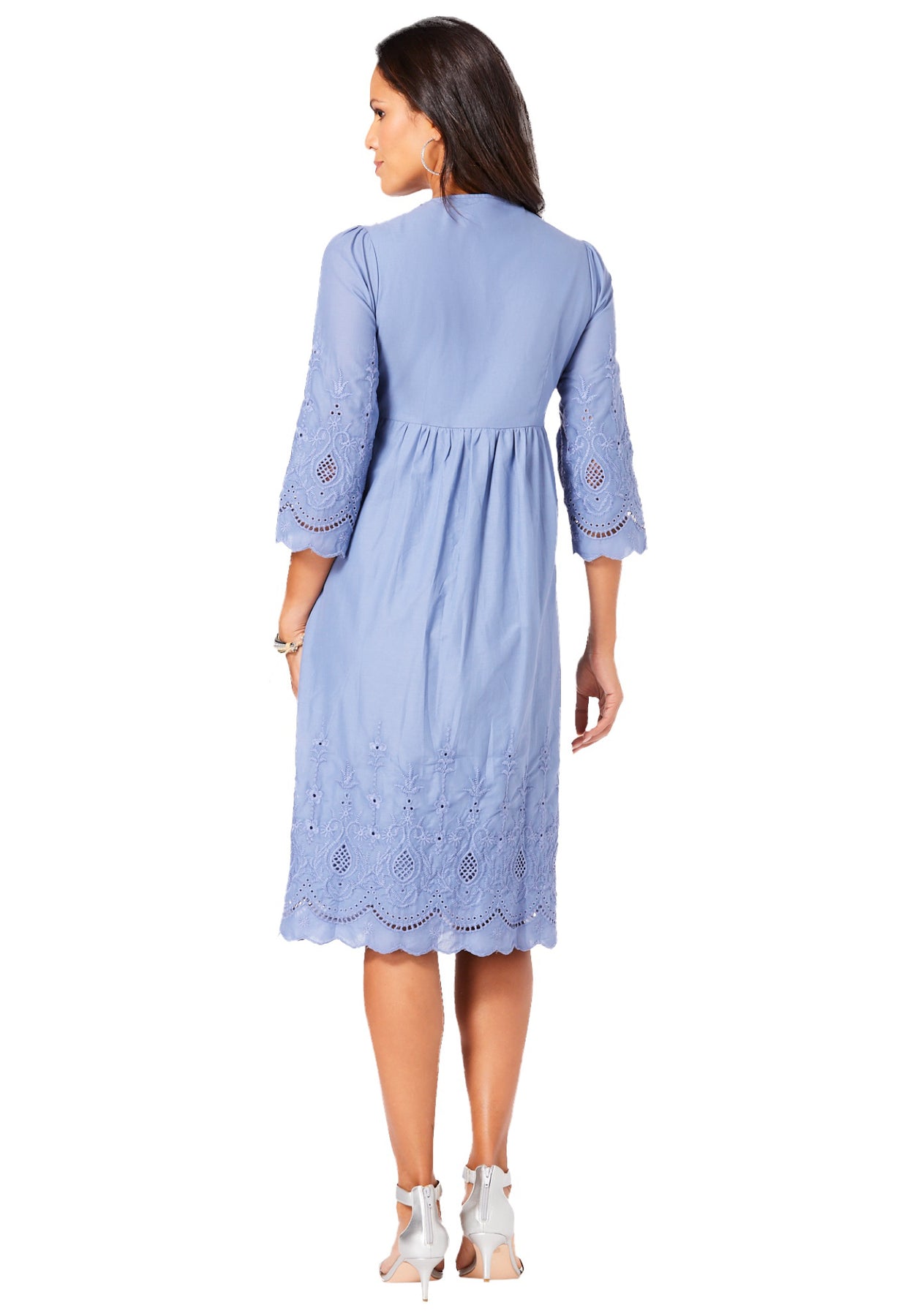 Your new weekend popover dress has arrived–crafted from soft cotton and featuring delicate eyelet details at the front. With charming novelty pearl buttons and scalloped cuffs, this effortlessly feminine style is perfect for brunch, a weekend getaway, or casual Fridays. Scoop neckline. Bell sleeves. Fully lined with a side zipper.