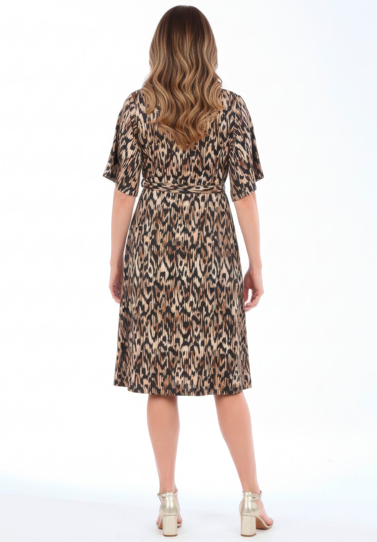 This chic dress features a flattering V-neckline and a faux wrap design with a self-tie waist that cinches at the side for a customizable fit. The elastic waistband ensures comfort while accentuating your shape, making it perfect for both casual and dressy occasions. V-neckline. Faux wrap style with attached self tie that wraps around waist to the tie at the side. Elastic waistband.