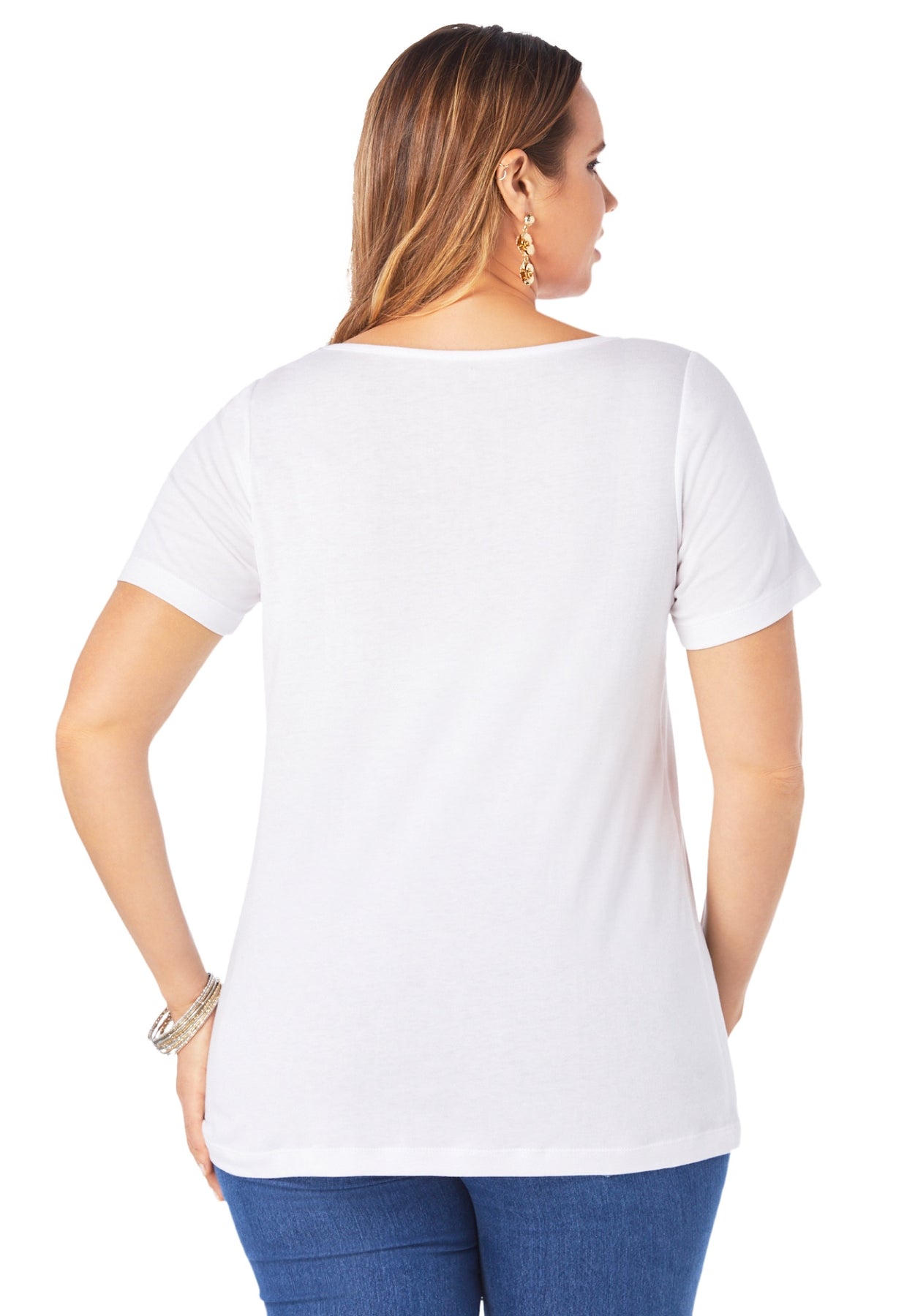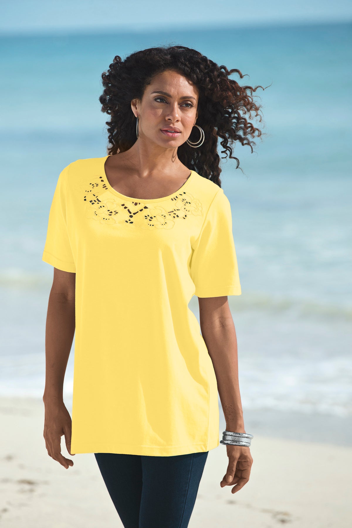 Add a hint of romance to your T-shirt collection—this style is updated with floral eyelet cutouts at the neckline. It's designed for a comfortable fit and made from breathable fabric that's so easy to layer, making it perfect for year-round wear.