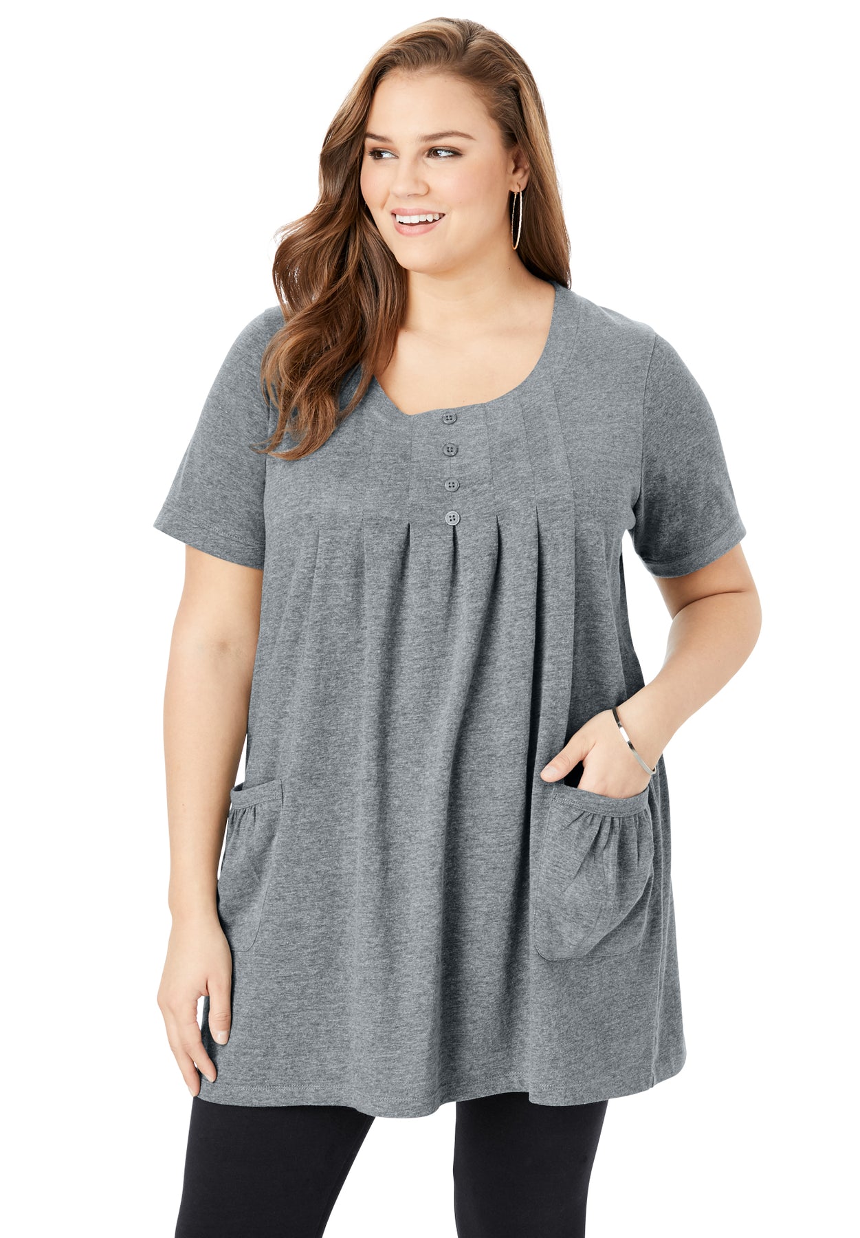 I had several of these tops from a number of years ago The quality has certainly gone downhill The fabric is much thinner and I wouldnt call it knit but more tshirt material It is still soft covers the hip area very well The neckline is a bit lower than Id prefer As with other WW and Rs clothes Im sure it will shrink a bit in cold wash and I do hang to dry I cant comment on whether its truetosize because Ive been losing weight and am ordering in my old size lol so it had to be returned for a smaller one A nice summer top but I wouldnt use the pockets as they arent as sturdy as the tops from years ago I also wouldnt call it an upscale top as its more of a modified tshirt