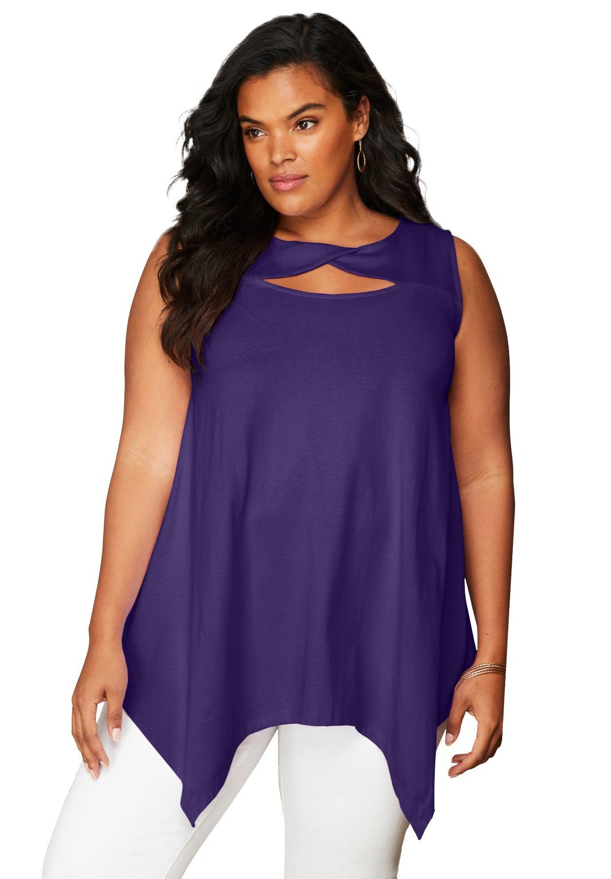With a pretty twisted cutout at the neck and a handkerchief hem, this style is sure to be your new favorite top. Pair it with boyfriend jeans and heels for day-to-dinner style. Crew neckline with seamed yoke.