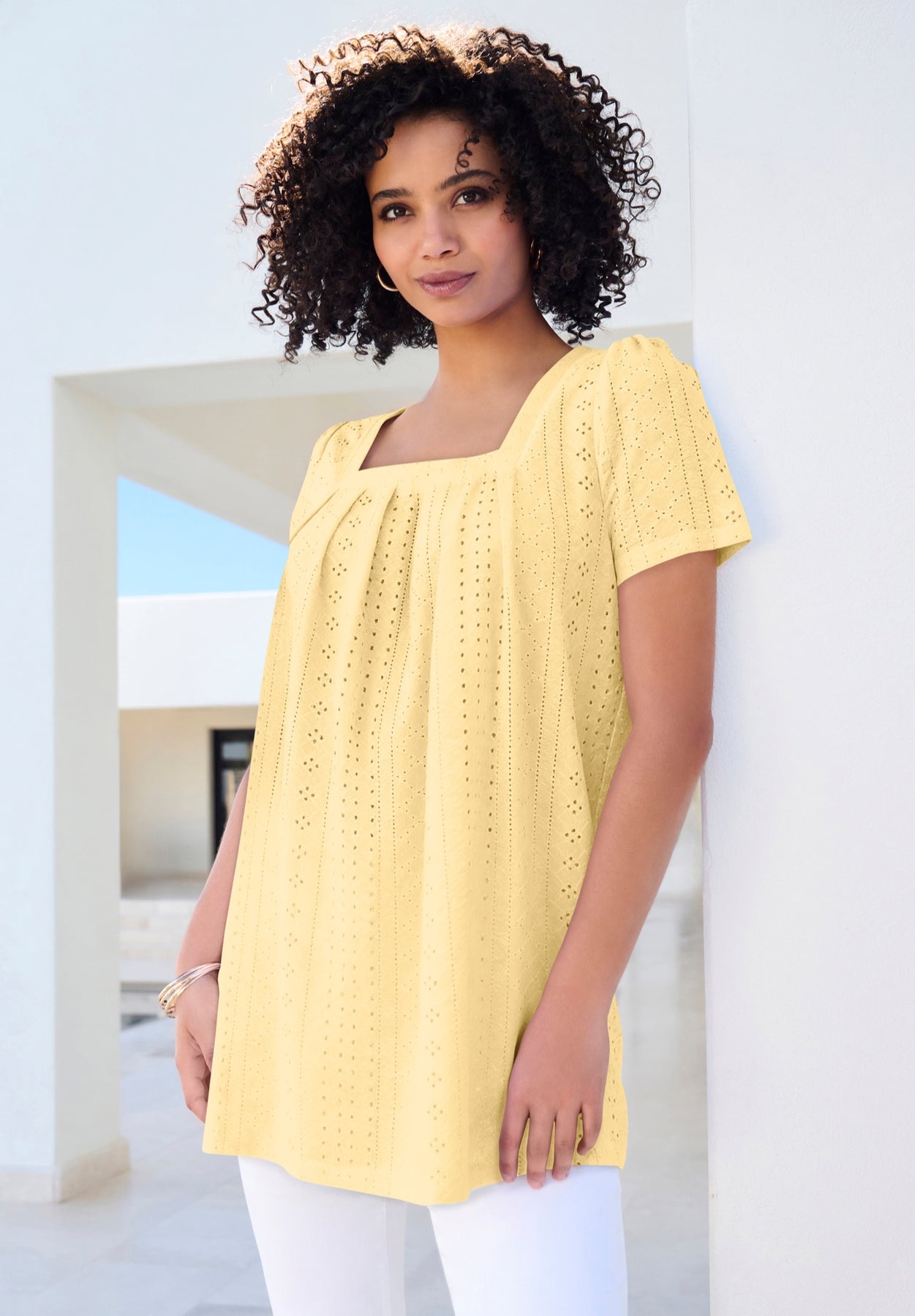 Elevate your casual wardrobe with this feminine tunic, crafted from a soft knit with intricate eyelet detailing. Featuring a flattering A-line shape, rounded square neckline, and flutter sleeves with shirring, it offers a relaxed yet refined fit. Perfect for layering or wearing solo, this tunic blends comfort and style effortlessly.