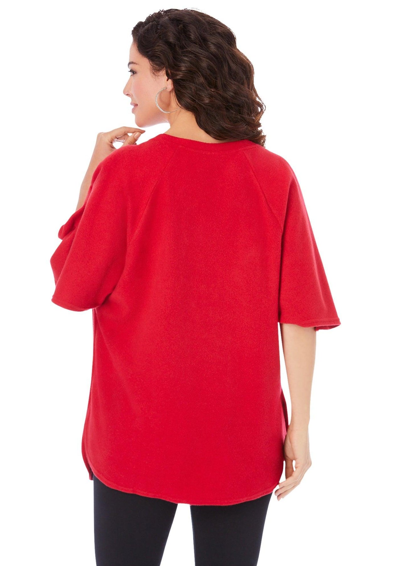 - Batwing raglan sleeves end above elbow