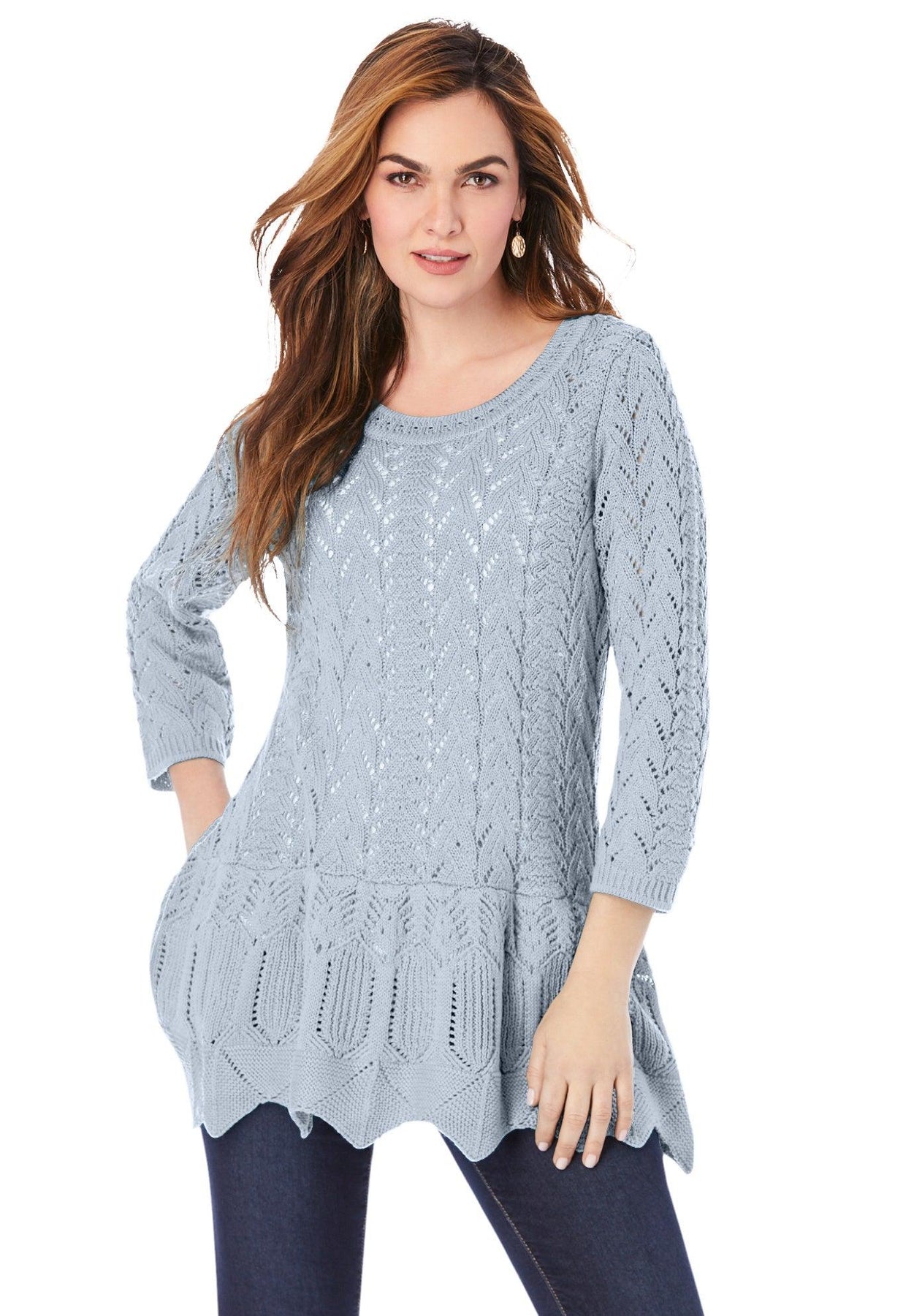 Styled with a scalloped hem, this pretty pullover is detailed with pointelle crochet. U-neck. Three-quarter sleeves.