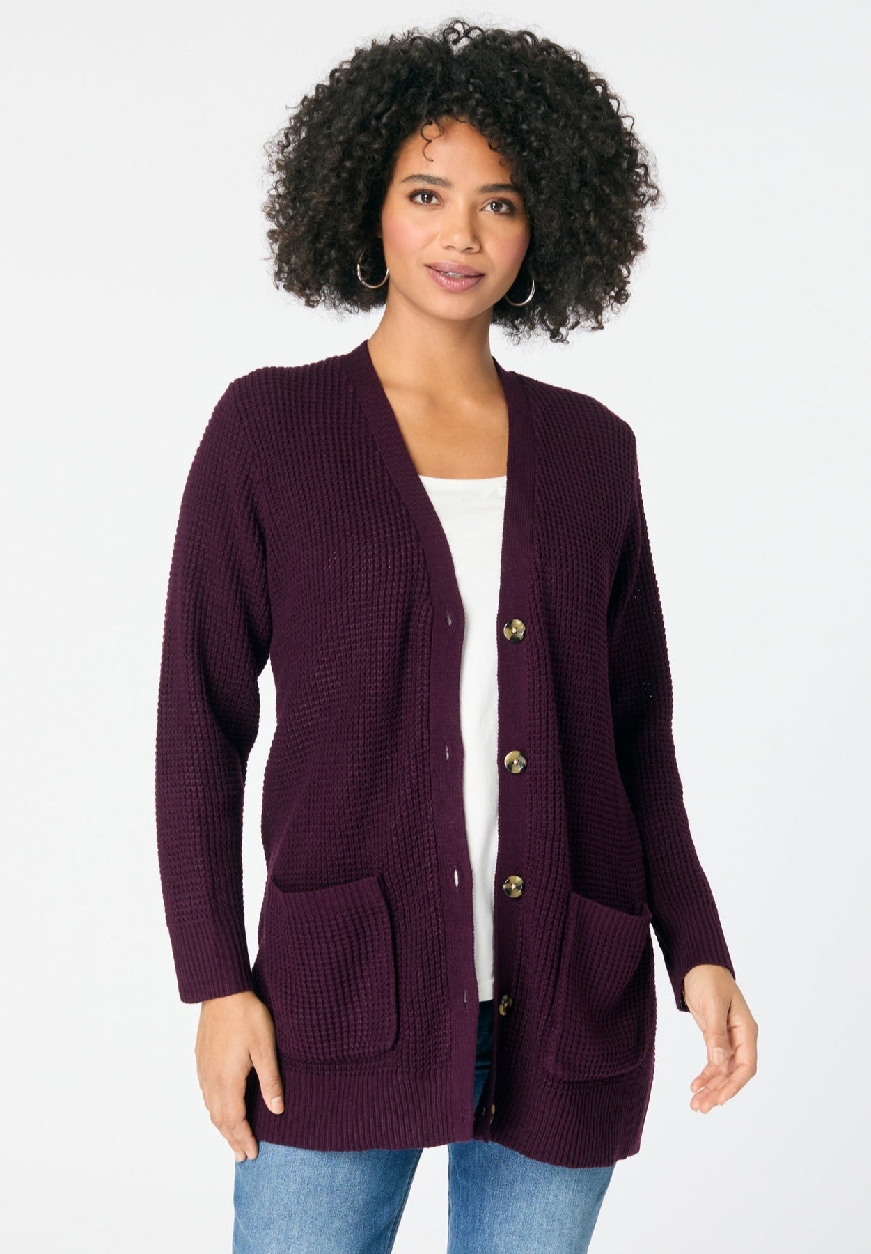 This refreshed version of our classic cardigan features a shorter length, a looser fit in the body and sleeves, and tortoise shell buttons for a modern twist. It's an ideal layering piece that blends comfort with timeless appeal with its waffle knit touch.