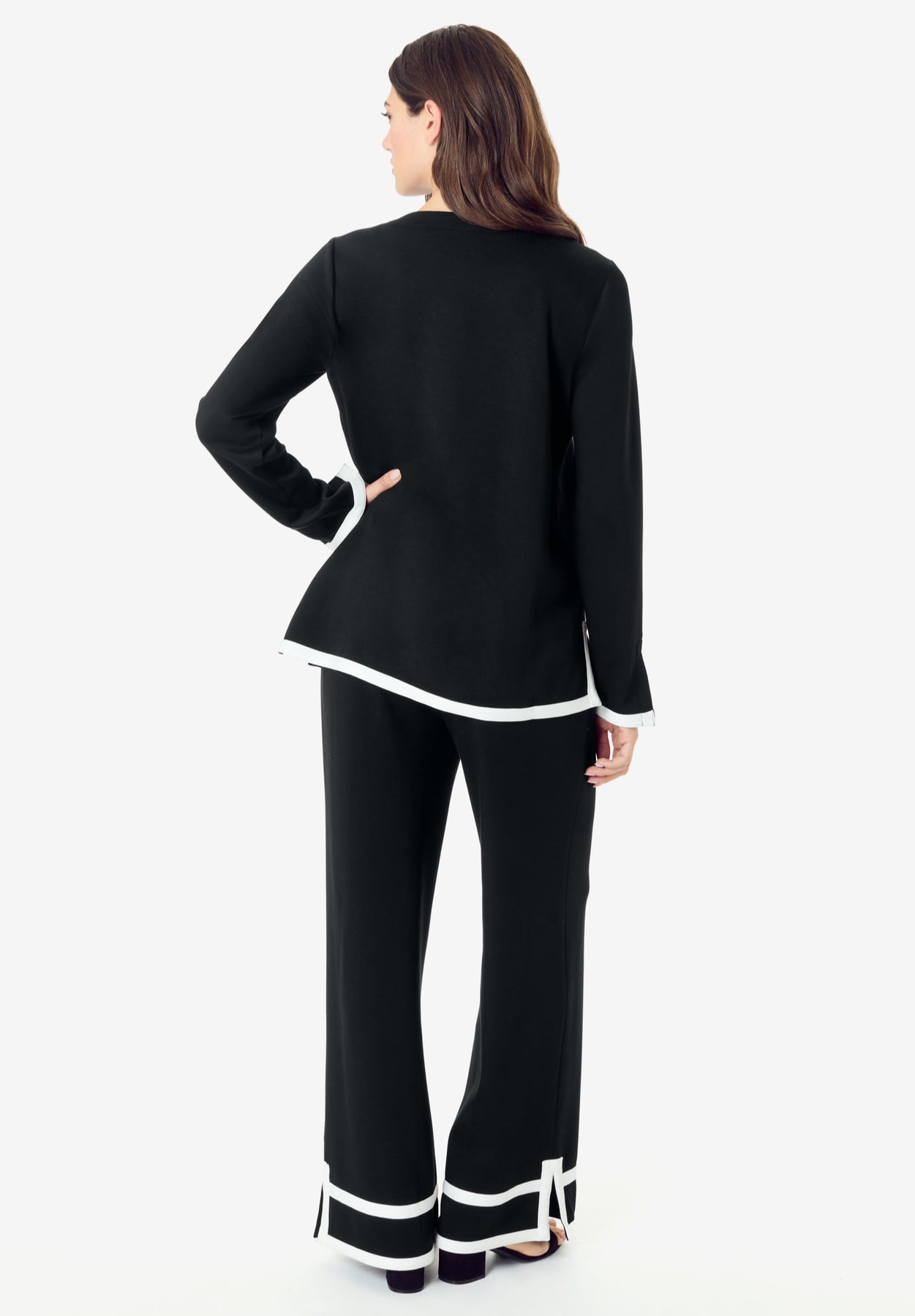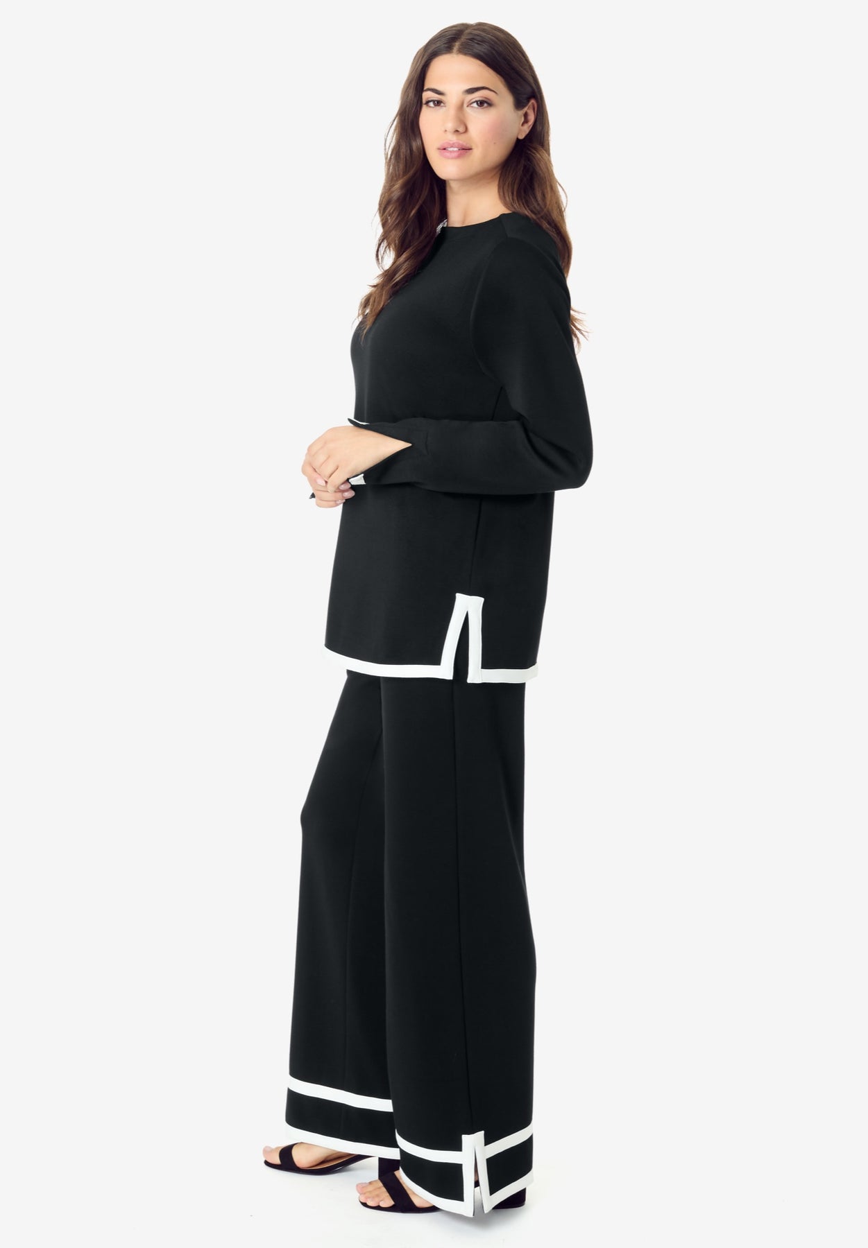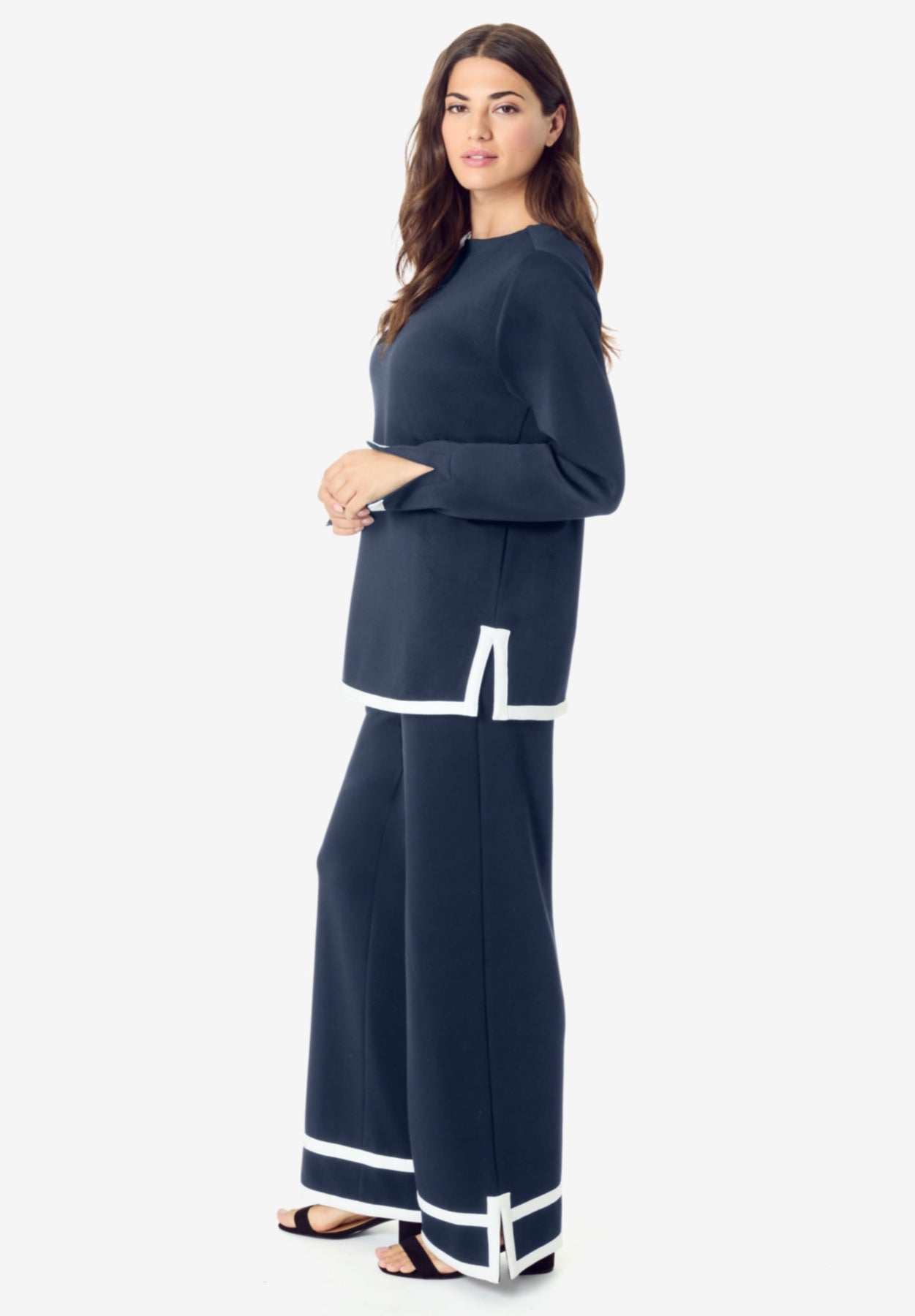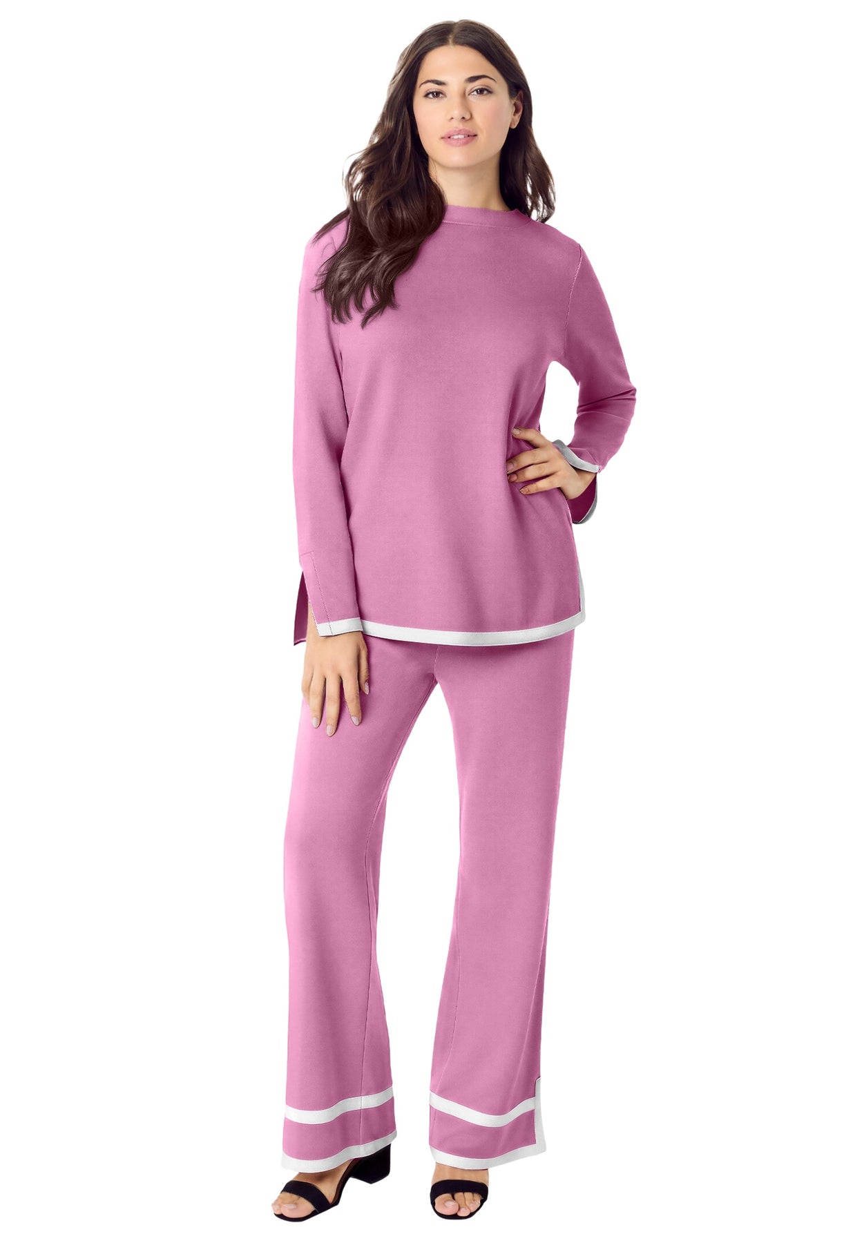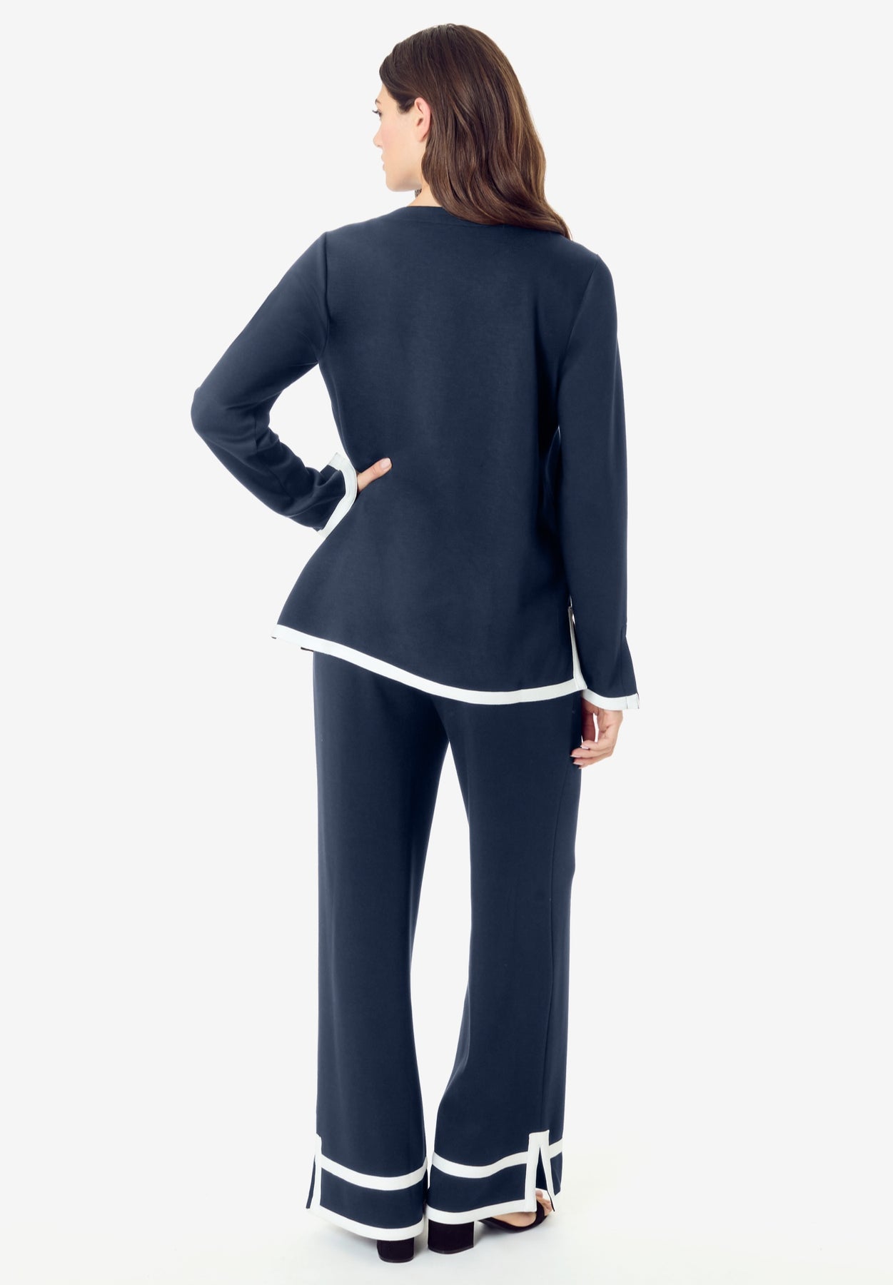 Coordinate and look great from head to toe with this lounge set. The color-blocked trim offers eye-catching contrast and understated style to its crewneck pullover and wide-leg pull-on pants. Side pockets.