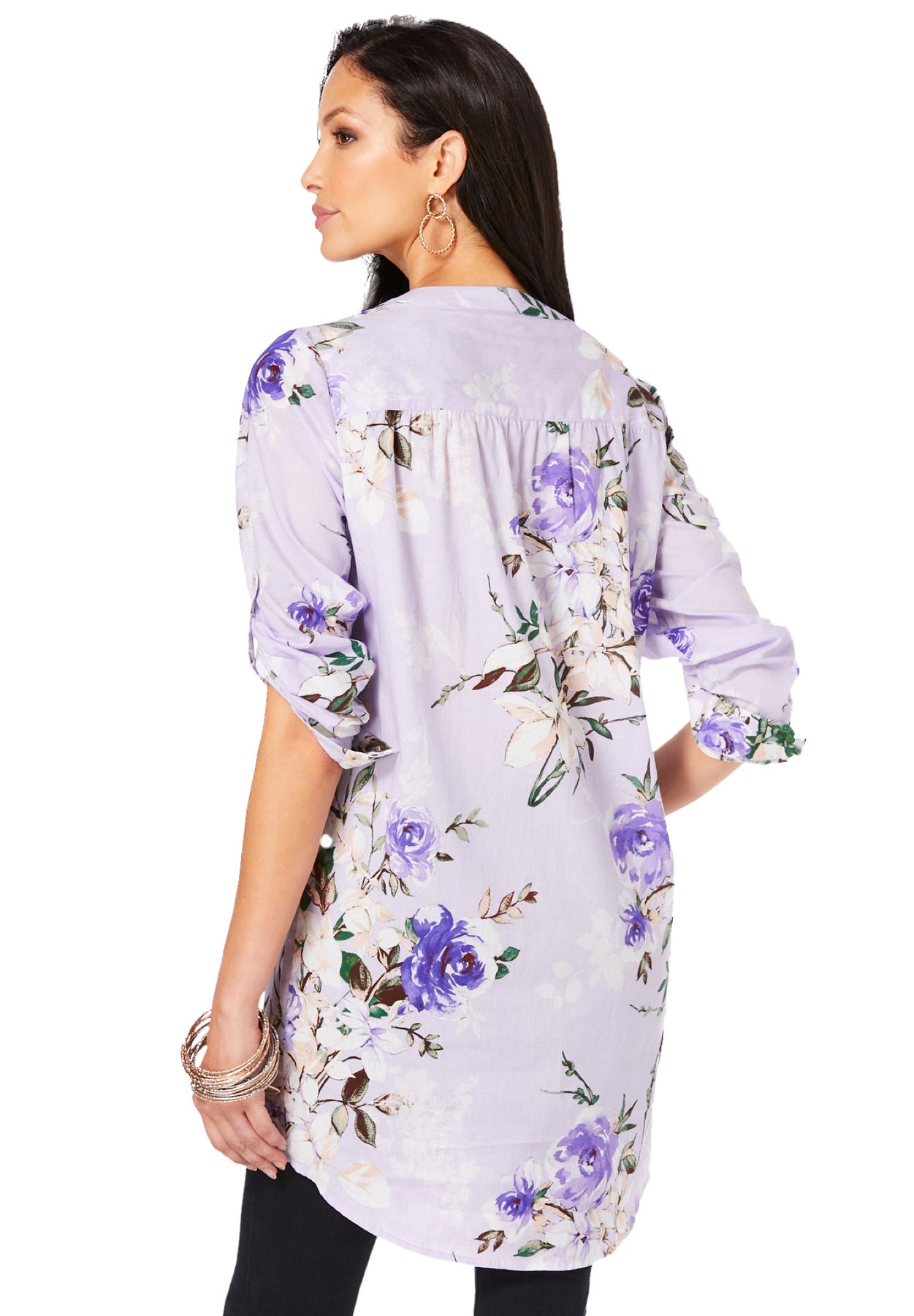 Plus Size Floral Y-Neck Pintuck Tunic – Adjustable Long Sleeve Button-Front, Relaxed Shirt Style | Roaman&