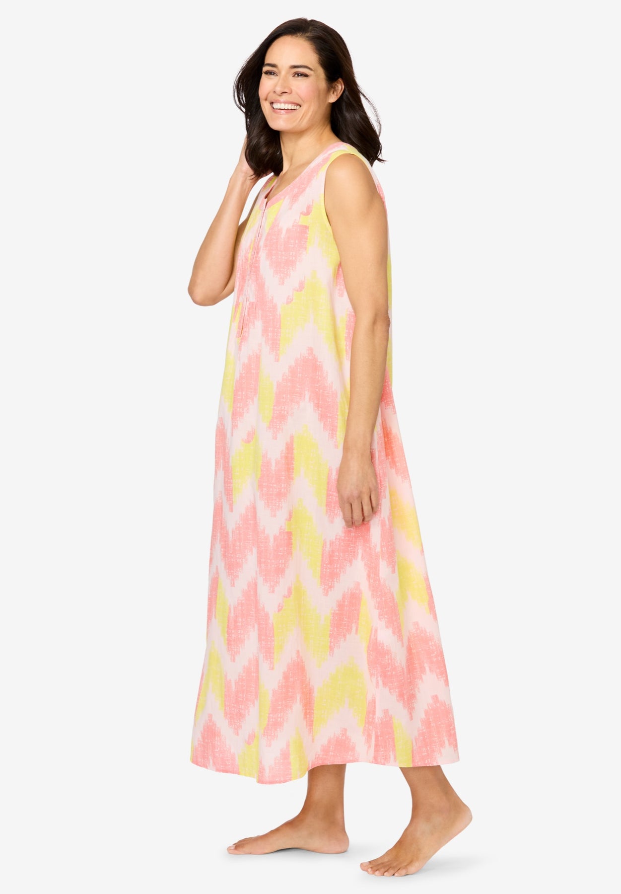 A lounger you'll love! Its flowing trapeze silhouette with shirring at waistline. Beautifully made with a functional button placket. Side seam pockets to carry your essentials as you relax throughout your day!