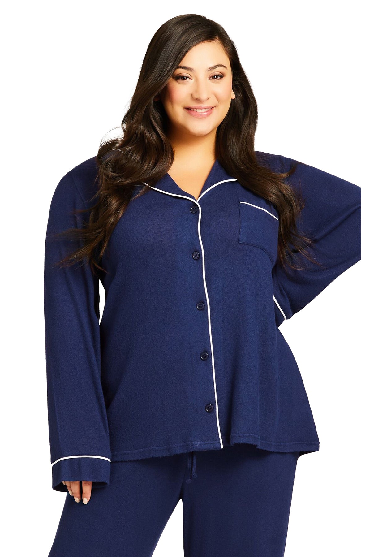 Soft to the touch and temptingly warm, this Hacci knit sleep top will feel like sleeping on a cloud. Button up into a soft V-neckline full-length sleeve made from dreamy Hacci knit you'll never want to take off.Key Features Include: - Shirt collar V-neckline- Full-length sleeves- Button up front closure- White piped trim- Soft stretch brushed Hacci knit fabrication- Hip length hemlinePair with the matching pants for a cozy night in!