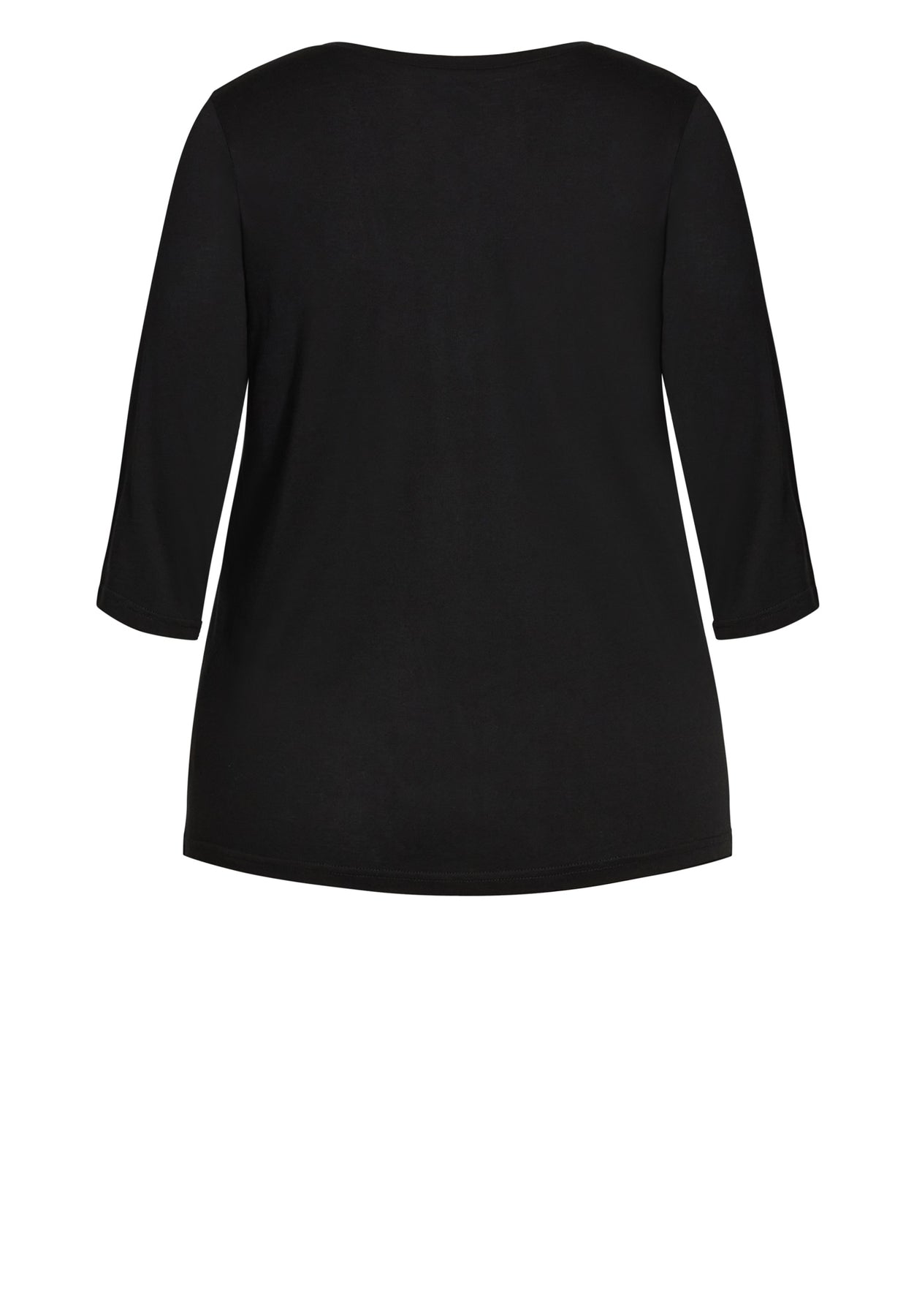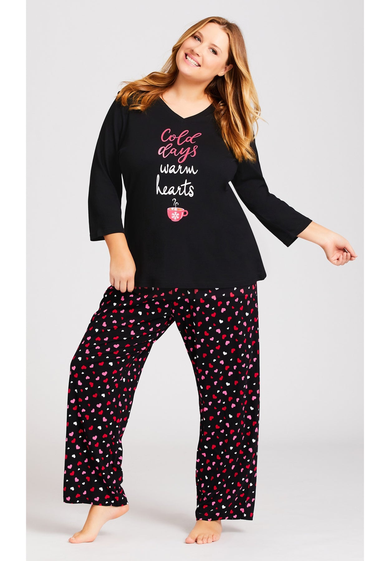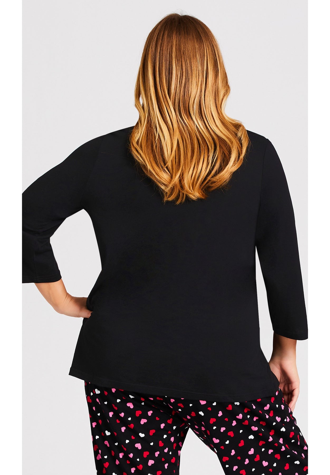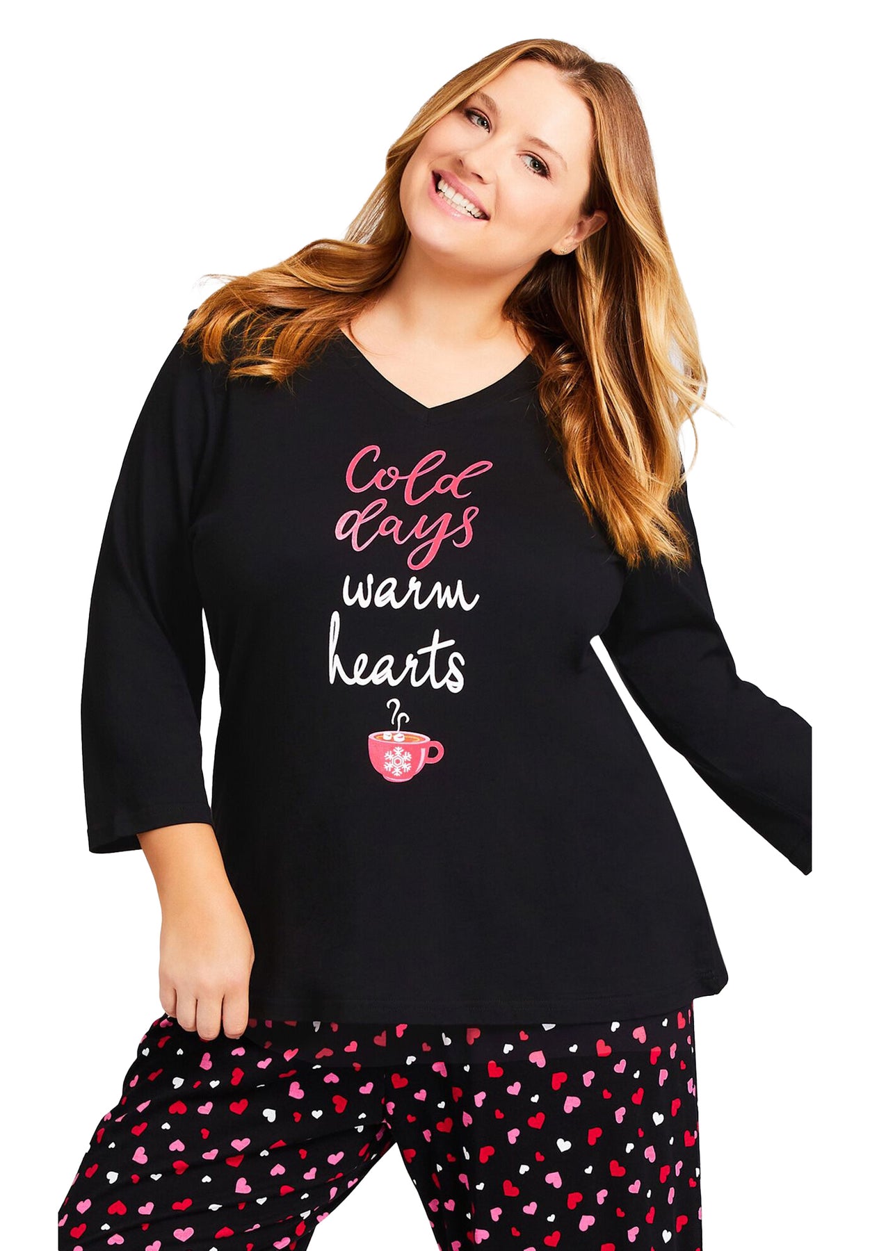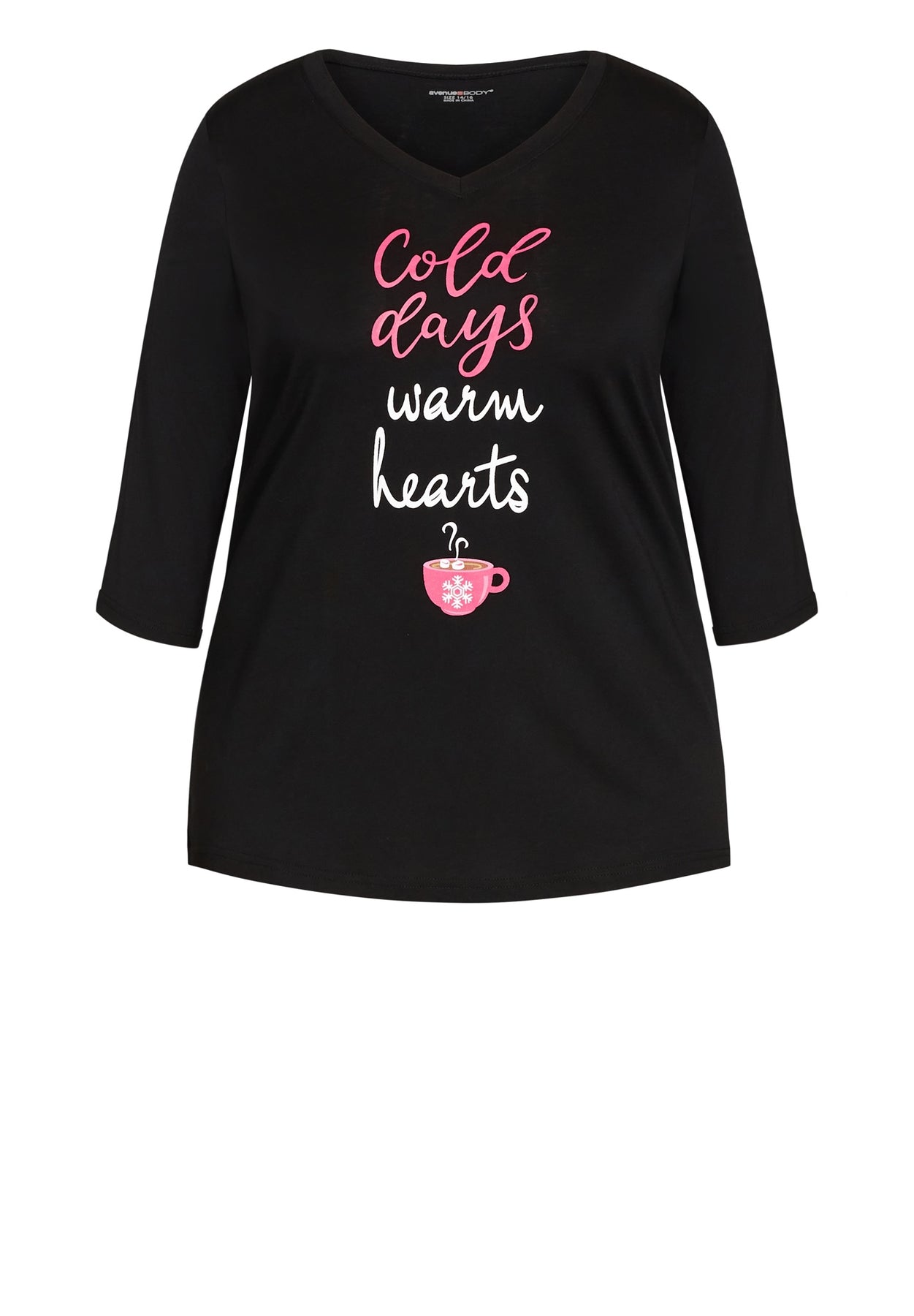 Tuck in and warm up with this slogan print sleep top that will keep you toasty in the coldest weather. This effortless piece will mix and match your sleep collection with ease.Key Features Include: - V-neckline- 3/4 length sleeves- Pull-over fit- Cozy slogan and graphic- Soft stretch fabrication- Straight hemline at hipsBest paired with some warm knit pants and a big cup of your favorite winter drink!