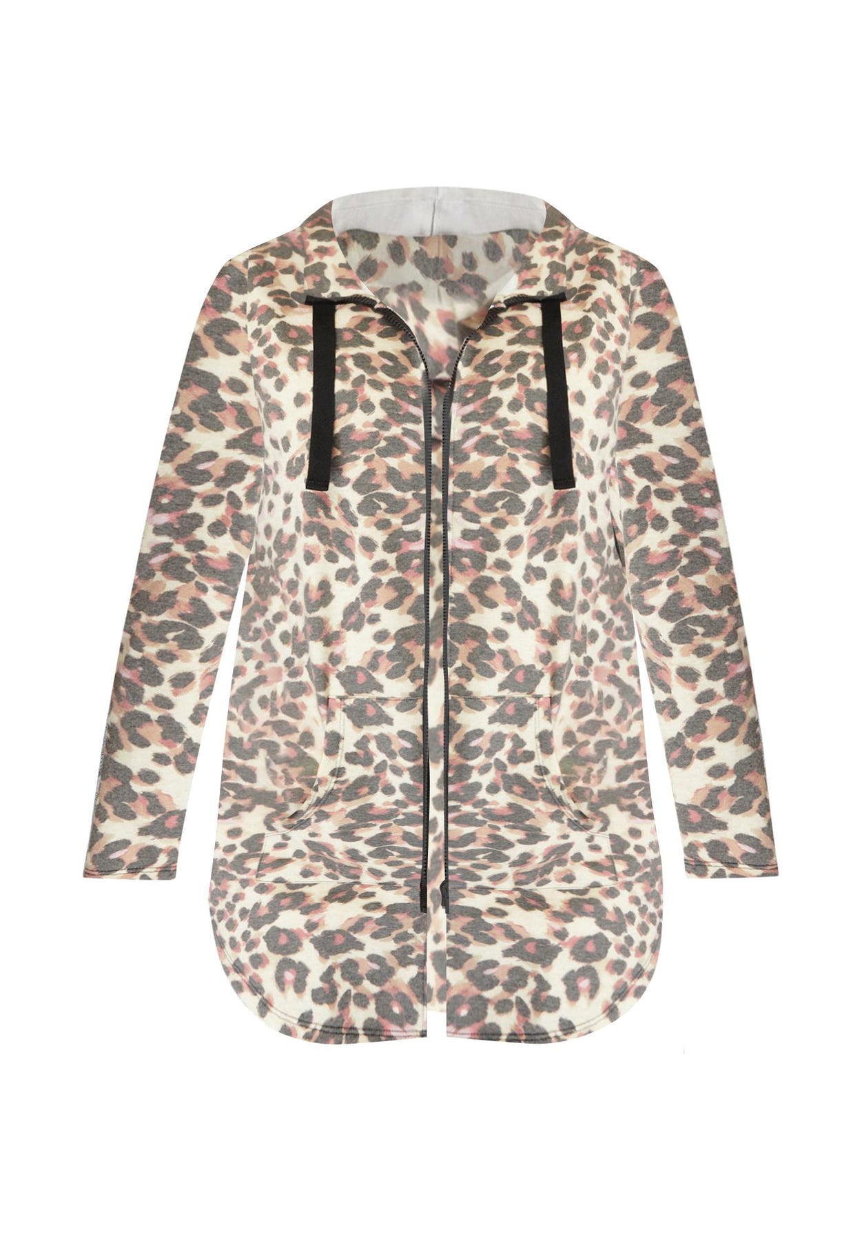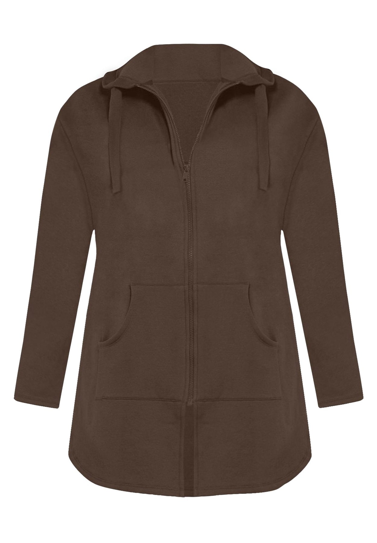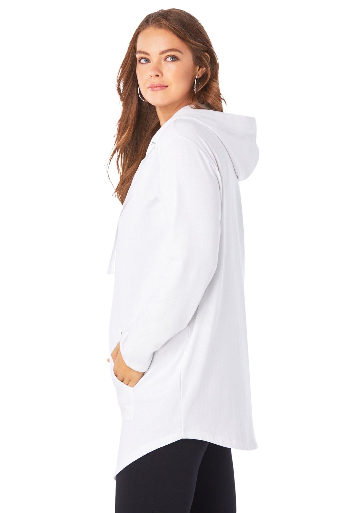 Your answer to everyday ease, this easy layer is a closet essential. Soft and comfy, with a zip front and shirttail hem for a looser style. Made extra-long to cover everything you want it to, this is the go-to over all your favorite tops and leggings. Drawstring at hood.