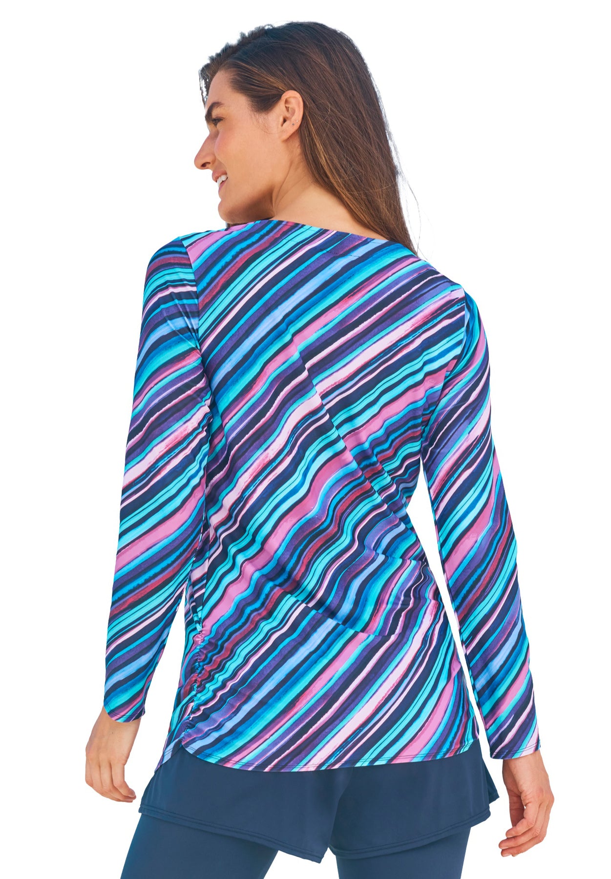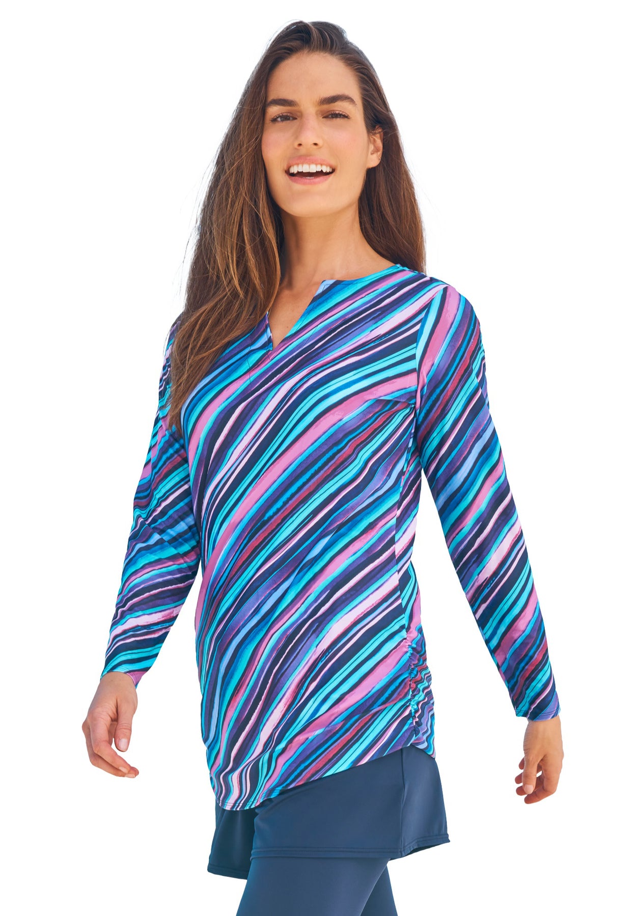 Embrace a waterside adventure and feel protected from the sun's rays with our long-sleeve swim tee. Ruched trim adds a stylish finishing touch to this lightweight top. It features a soft built-in shelf bra and power-mesh lining to offer comfort and slight compression. Sewn-in molded foam cups and a smooth underband. Relaxed fit. Unlined.