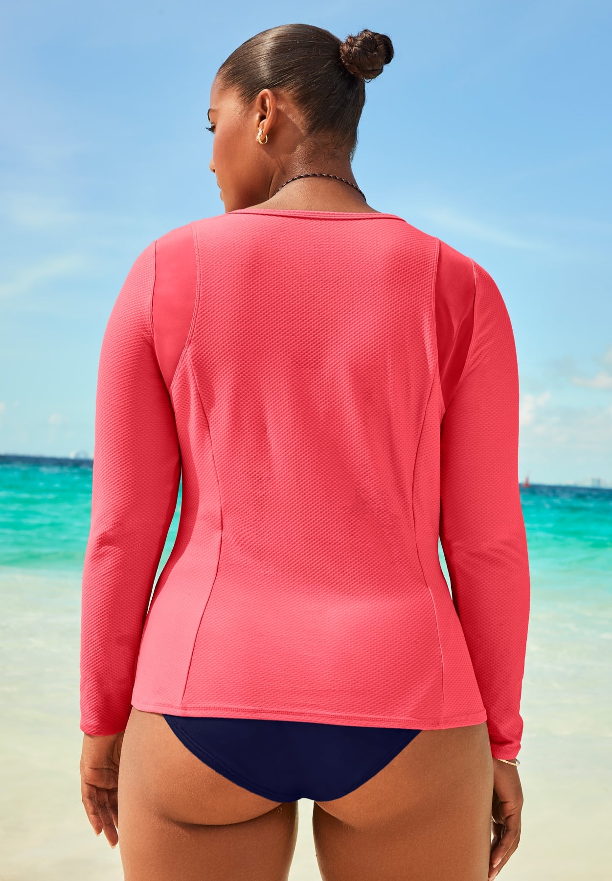 Sleek, lightweight, and sun-ready. This quick-dry knit rash guard combines sporty performance with streamlined style. An invisible quarter-length zipper ensures easy wear and comfort, while princess seams contour the shape for a flattering fit. Ultra-sheer mesh panels at the armholes add breathability and modern edge. Designed with UPF 50 sun protection and chlorine-resistant fabric, it’s made to outlast beach days and pool plunges.