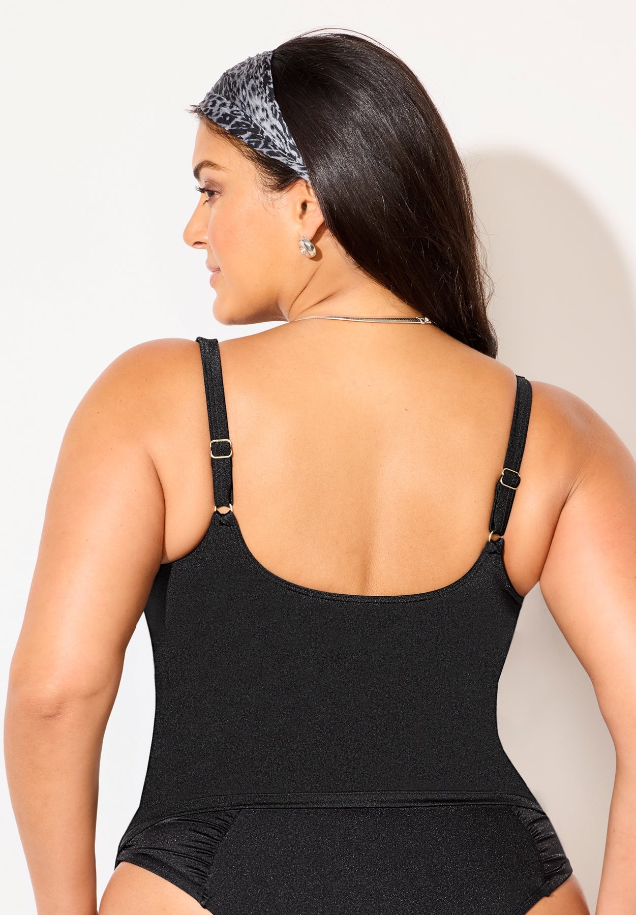 Make a splash with shimmer and support. This tankini top combines flattering design and comfortable structure, including supportive underwire with removable push-up cups and a hidden inner bra back with secure G-hook closure. Underbust and front-body shirring create a sculpted fit, while contrast piping highlights the neckline. Adjustable straps ensure your perfect fit — confidence never looked this good.