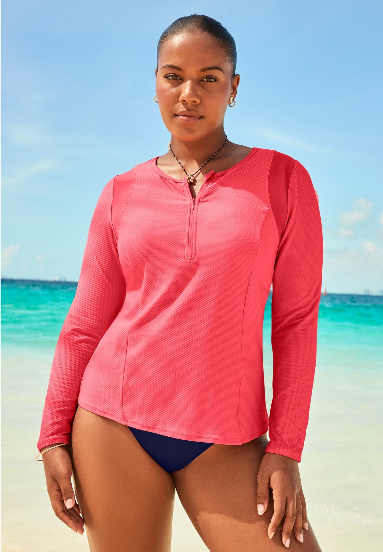 Sleek, lightweight, and sun-ready. This quick-dry knit rash guard combines sporty performance with streamlined style. An invisible quarter-length zipper ensures easy wear and comfort, while princess seams contour the shape for a flattering fit. Ultra-sheer mesh panels at the armholes add breathability and modern edge. Designed with UPF 50 sun protection and chlorine-resistant fabric, it’s made to outlast beach days and pool plunges.