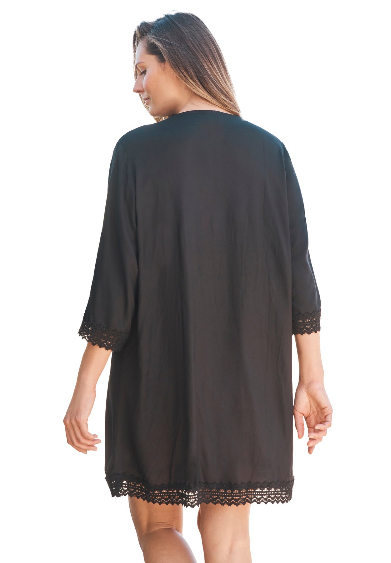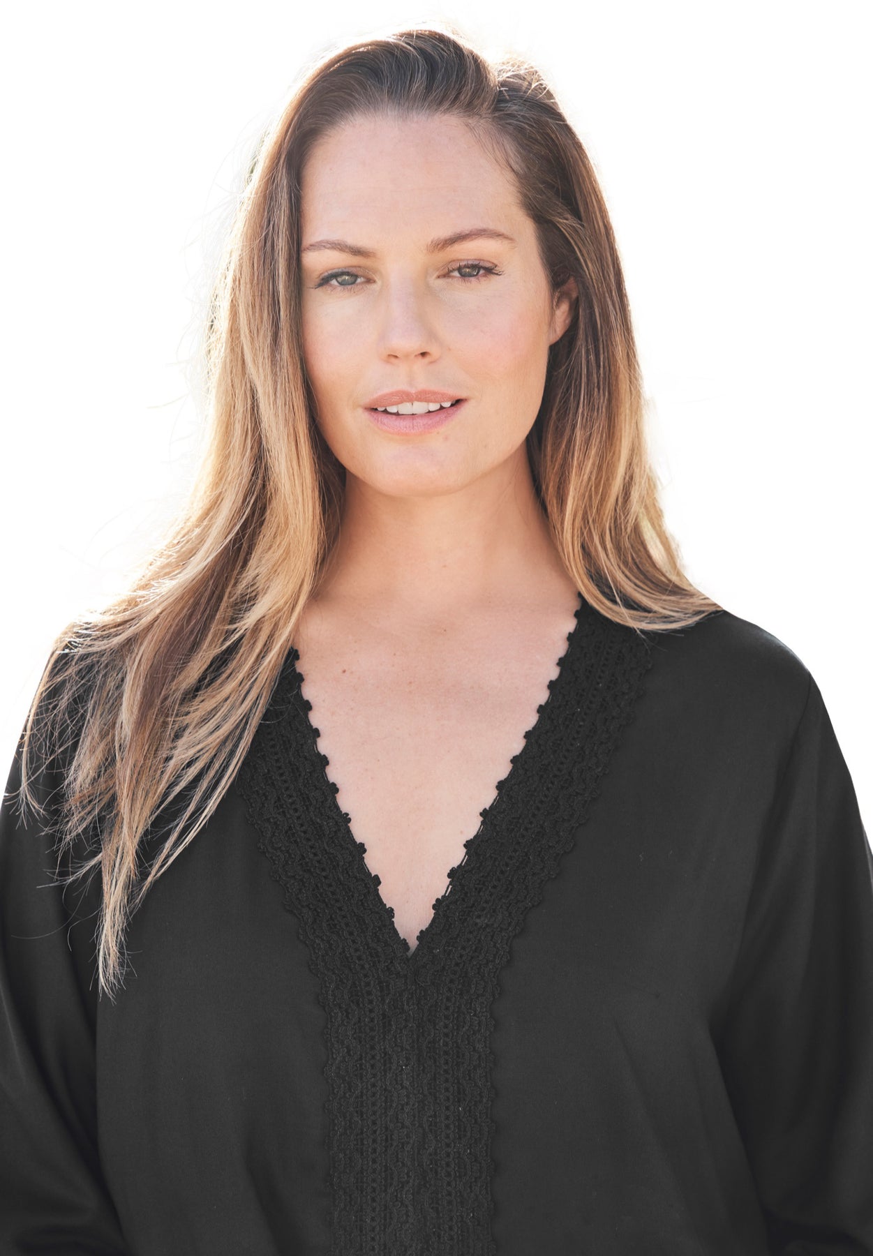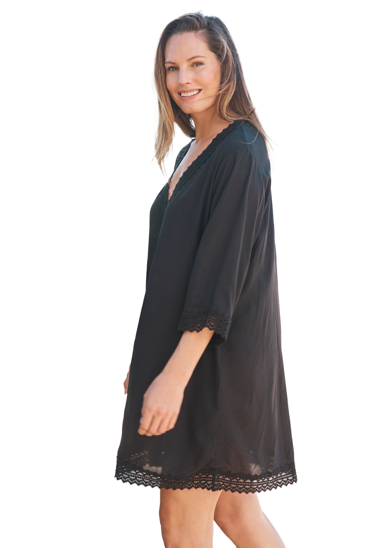 Take this feminine cover-up on your next vacation. Crochet trimming adorns the V-neckline, sleeves and hem. Three-quarter sleeves make it the perfect addition to any waterside adventure.