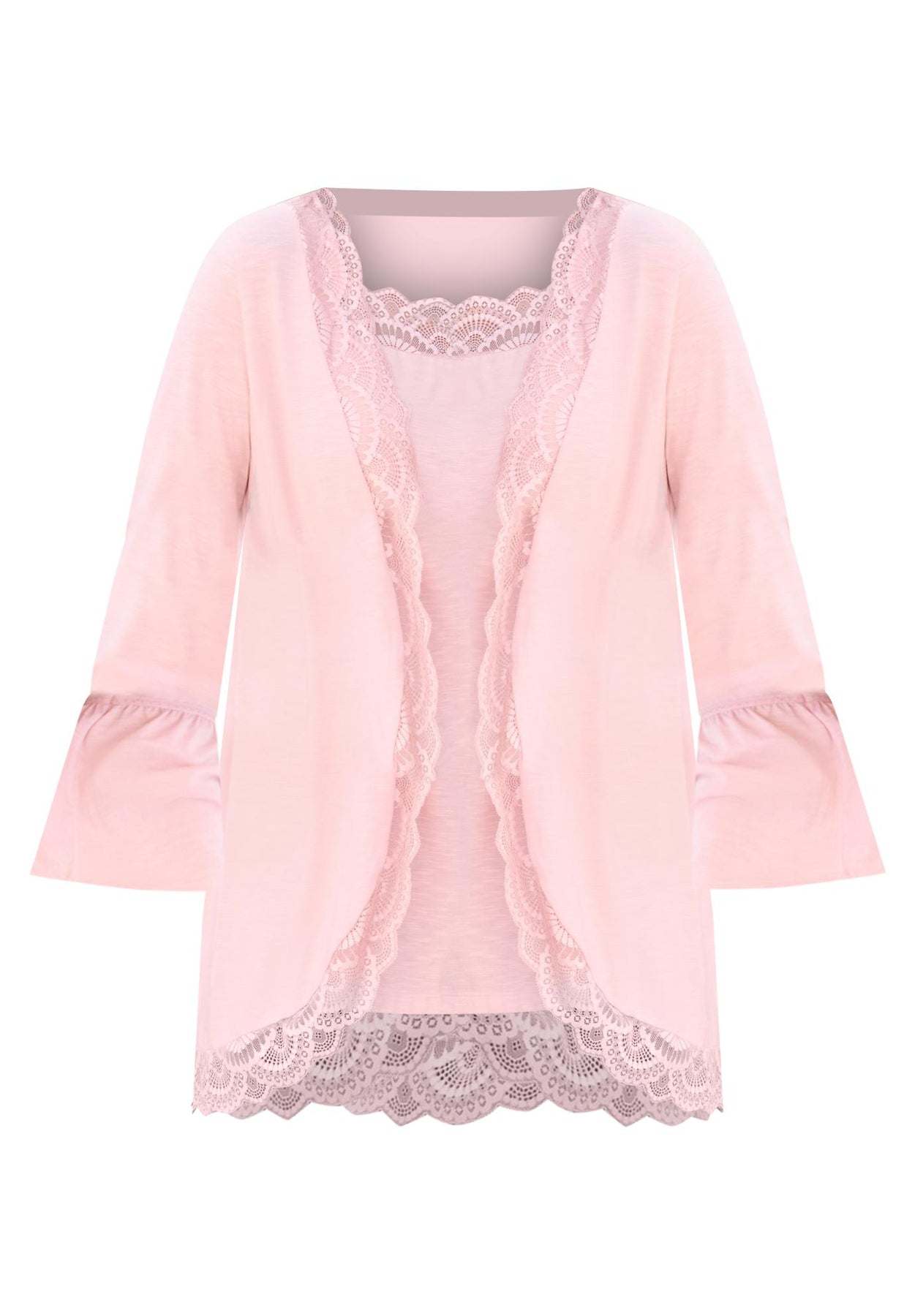 Double up on intricate and rich lace detail with this set. Lace trim lines both the open front and rounded hem of the cardigan and the square neck of the tank, offering alluring charm to your look. Bracelet-length bell sleeves on the outside layer add a final flourish. Banded straps and relaxed silhouette on the tank. It's incredibly versatile—wear the set together, style the tank alone or layer the cardigan over a sleeveless dress.