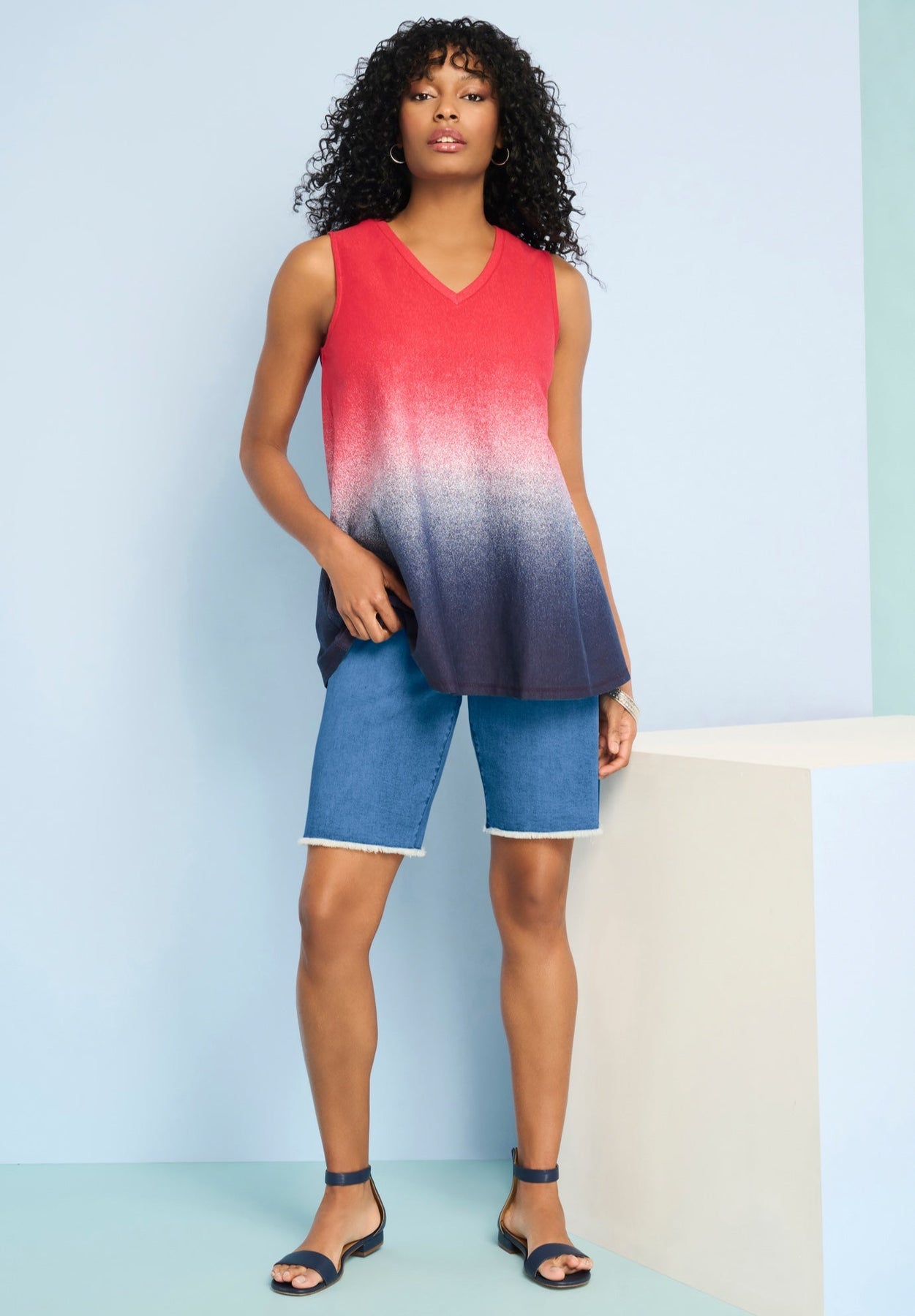 Perfect for celebrating American holidays with pride, this red, white and blue tank features a stunning ombré pattern and is cut in your favorite swing silhouette.