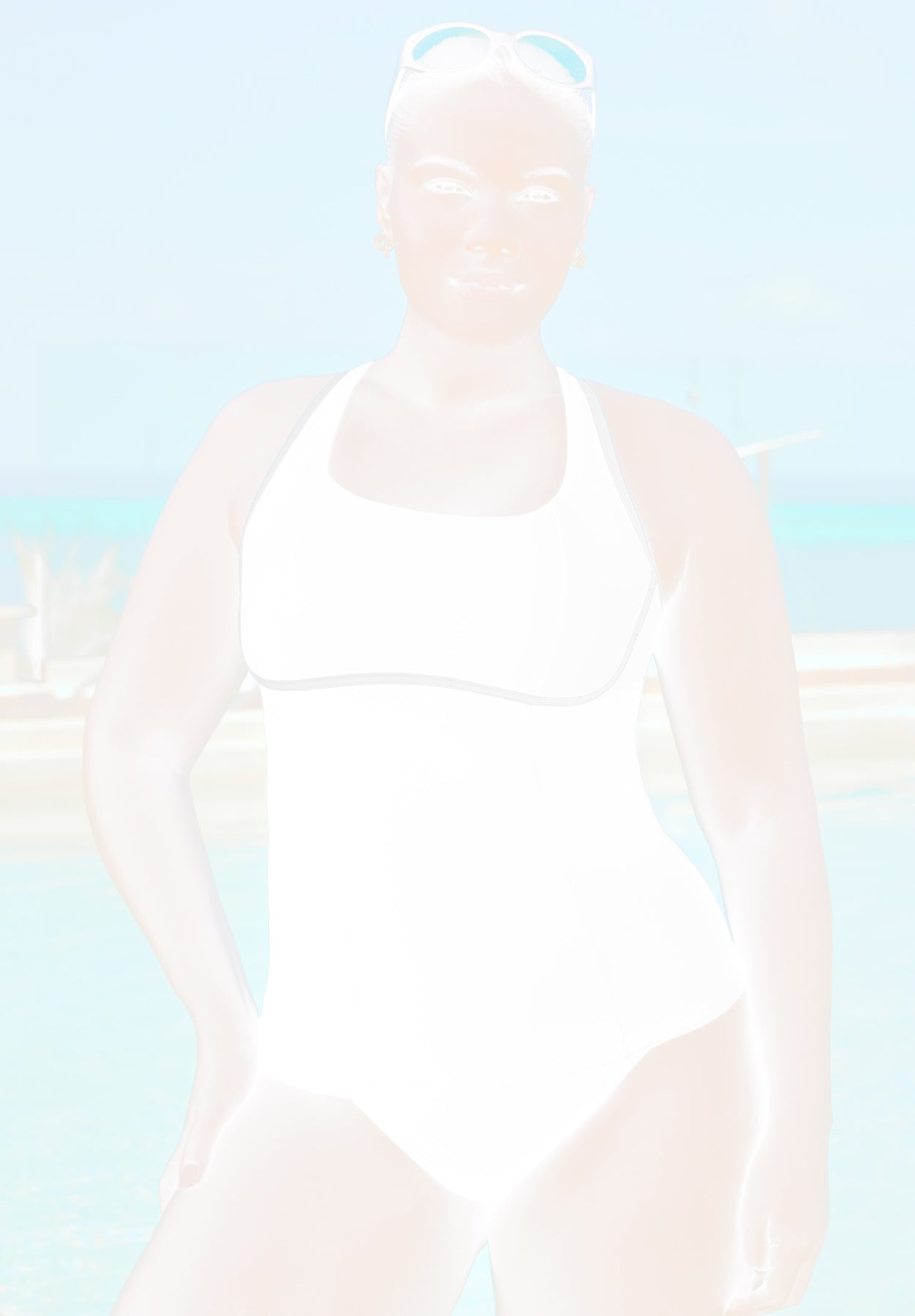 Classic structure meets modern detail in this square neck tankini top. Sewn-in cups and front princess seams create a smooth, sculpted silhouette. Contrast binding along the underbust and armholes adds a sleek pop of definition. X-back straps with matching contrast trim enhance both style and support, and Power Mesh–lined back wings provide smoothing, confident fit.