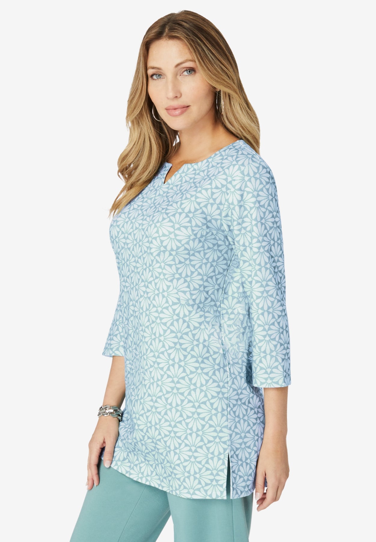 Plus Size Three-Quarter Sleeve Notch Neck Soft Knit Tunic | Roaman&