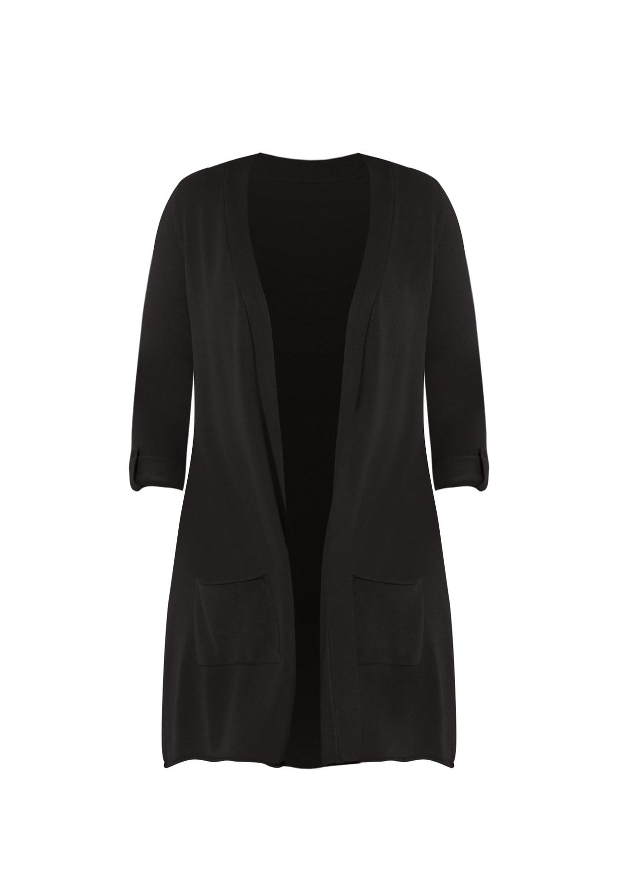 FIT: Long, tunic-length silhouette with roll-tab sleeves and front patch pockets. Finished edge for a smooth, polished look.