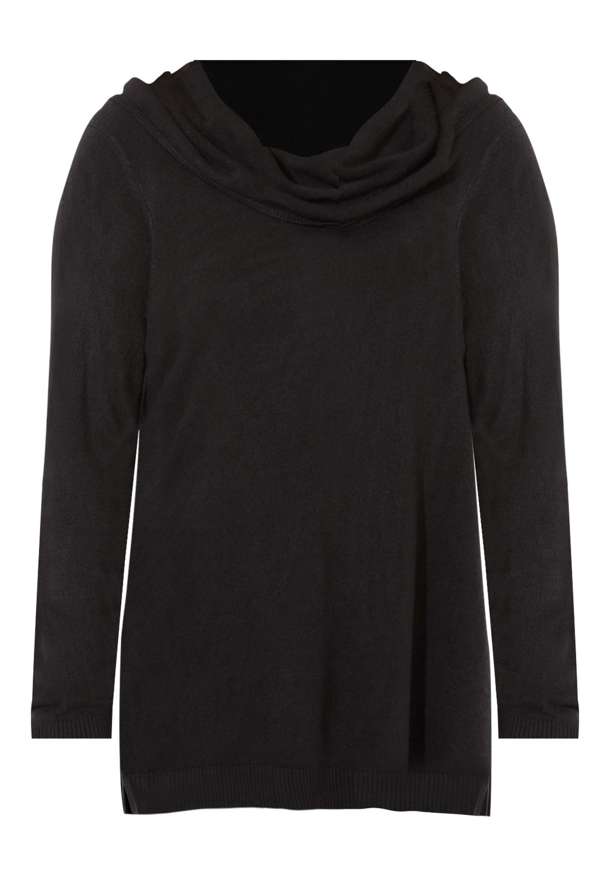 FIT: Feminine and relaxed with a soft, drapey cowl neckline. Long sleeves with rib trim. Side slits for easy movement.