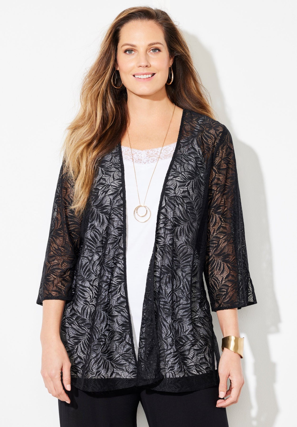FIT: Easy wearing, relaxed silhouette. Embroidered lace. Designed with an open front, three-quarter length sleeves, and 4” side slits on sleeves and hem.
