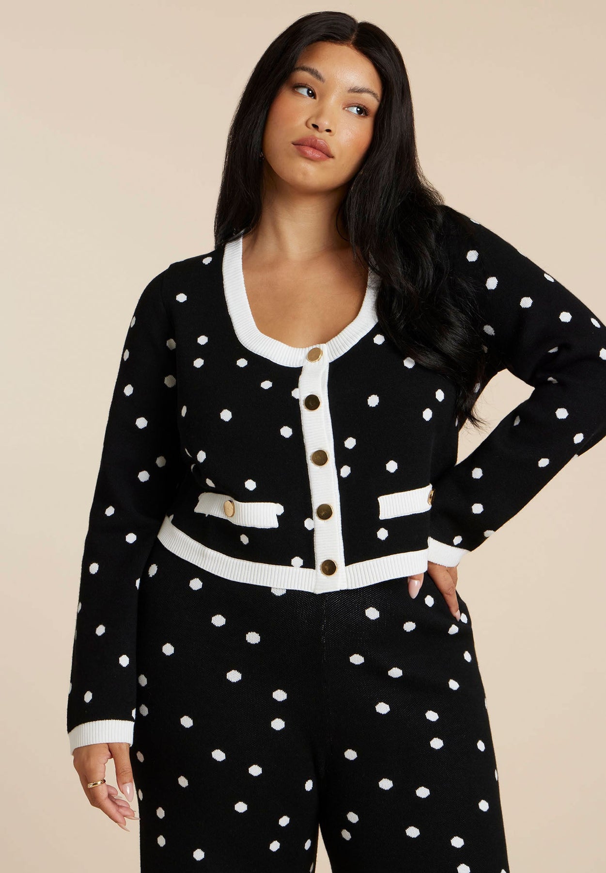 Heritage intarsia knit gets a tailored upgrade in this cropped polka-dot jacket. Buttoned and close-fit with soft stretch, it layers like a cardigan but delivers jacket-level polish.