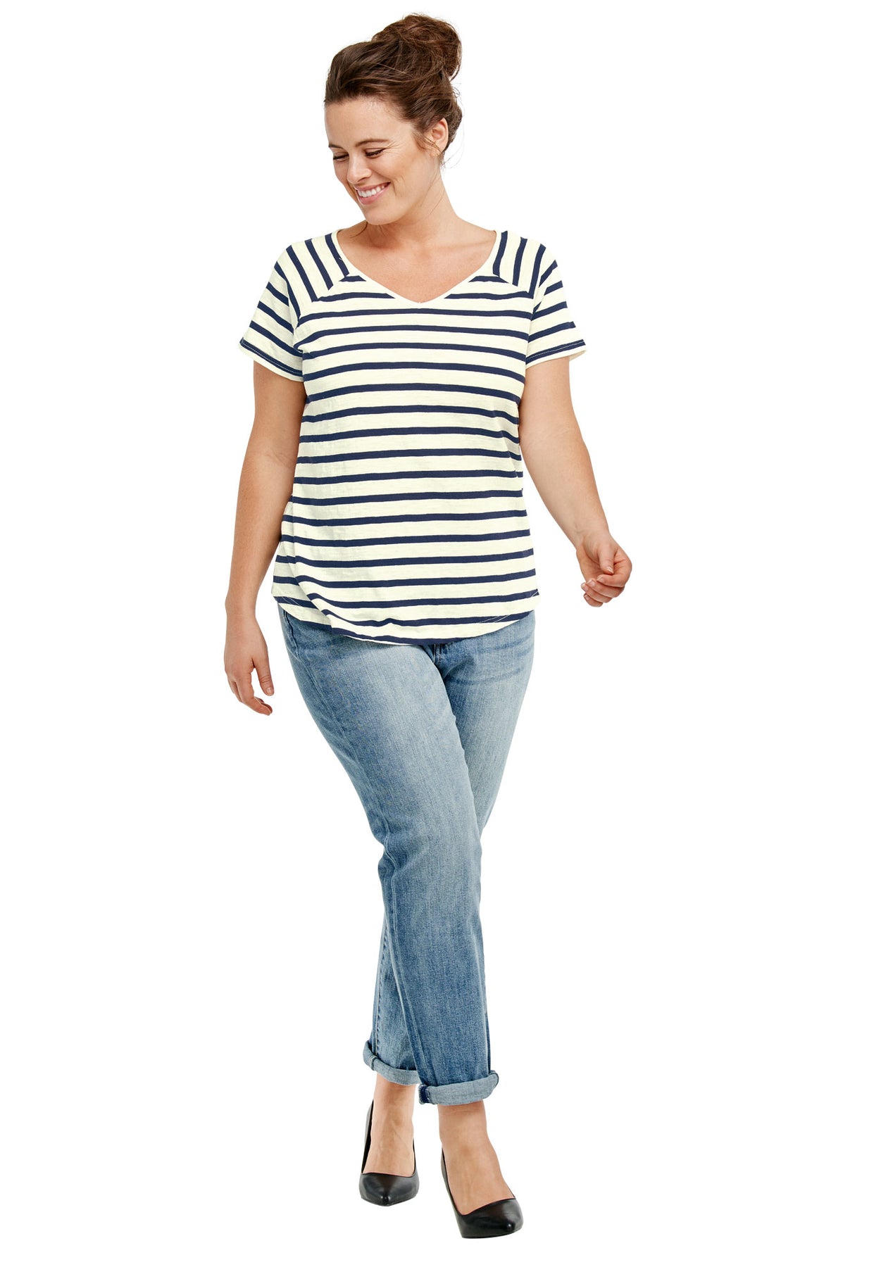 Relaxed silhouette with V-neck. Short cap raglan sleeves. Slight shirttail hem.
