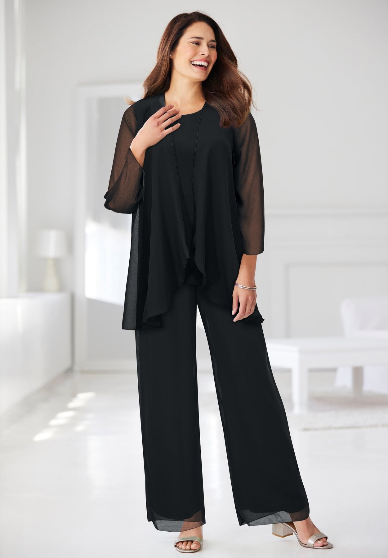 Feel elegant in our beautiful 3-Piece Pant Set! A flowing open-front jacket that lays to your body creating a graceful silhouette. A 2-tier lined Georgette tank that layers underneath. Comfortable yet stylish pull-on pant with an all around elastic-waist and a silky-soft lining.