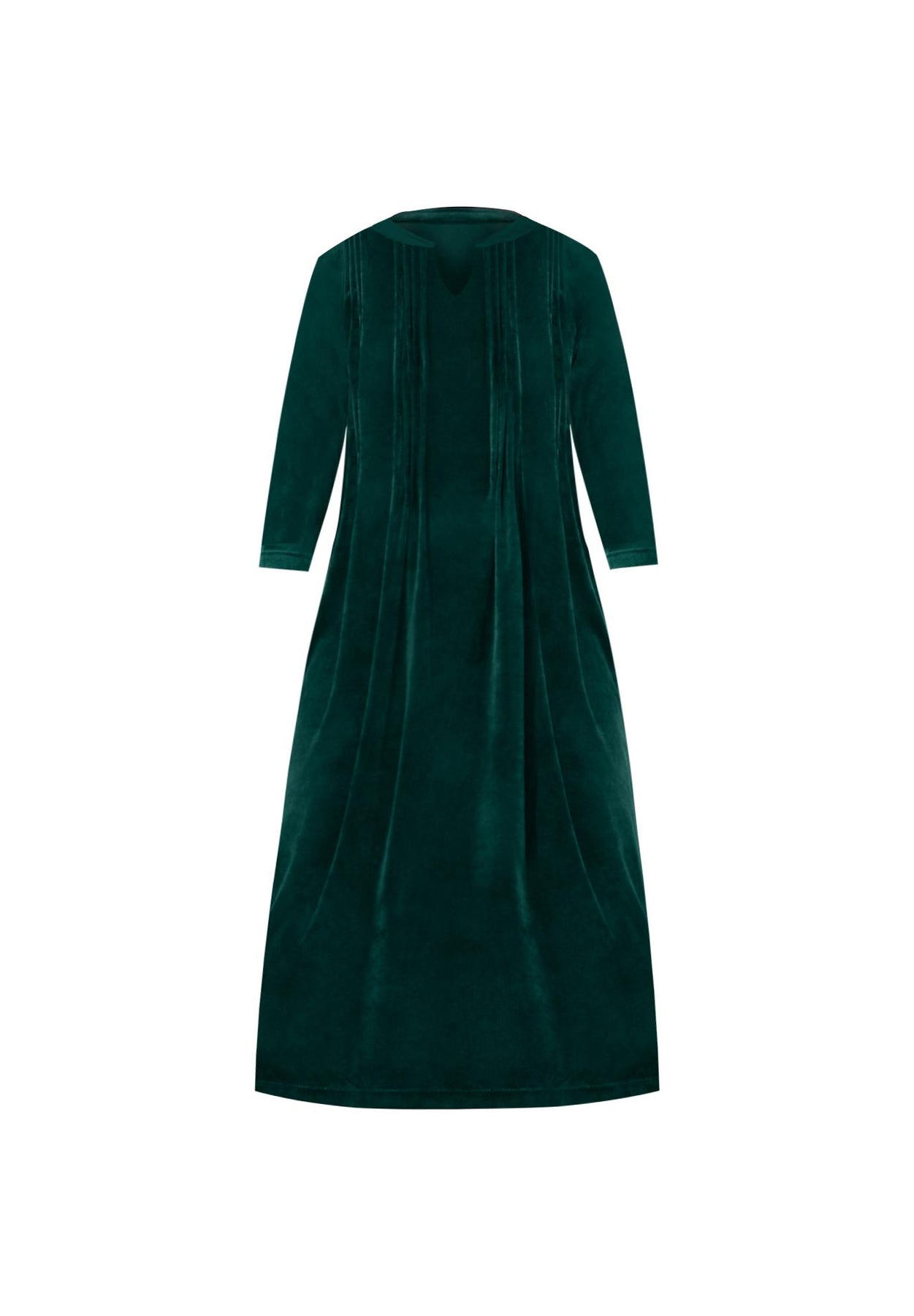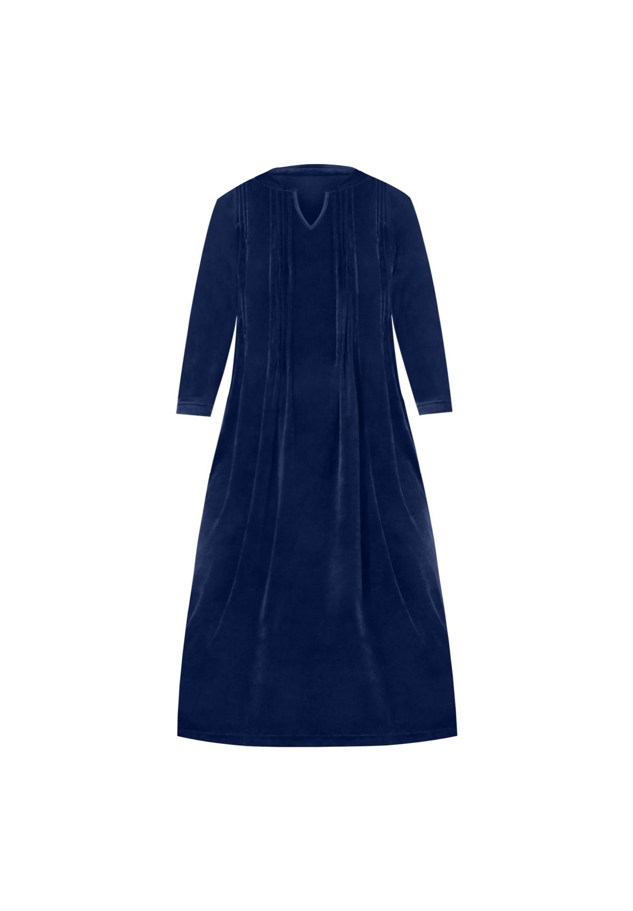 This dress is made with the softest velour and flattering shape to keep you looking good and feeling better! Made with a v-neckline and three-quarter sleeves. Pintucks at waist.