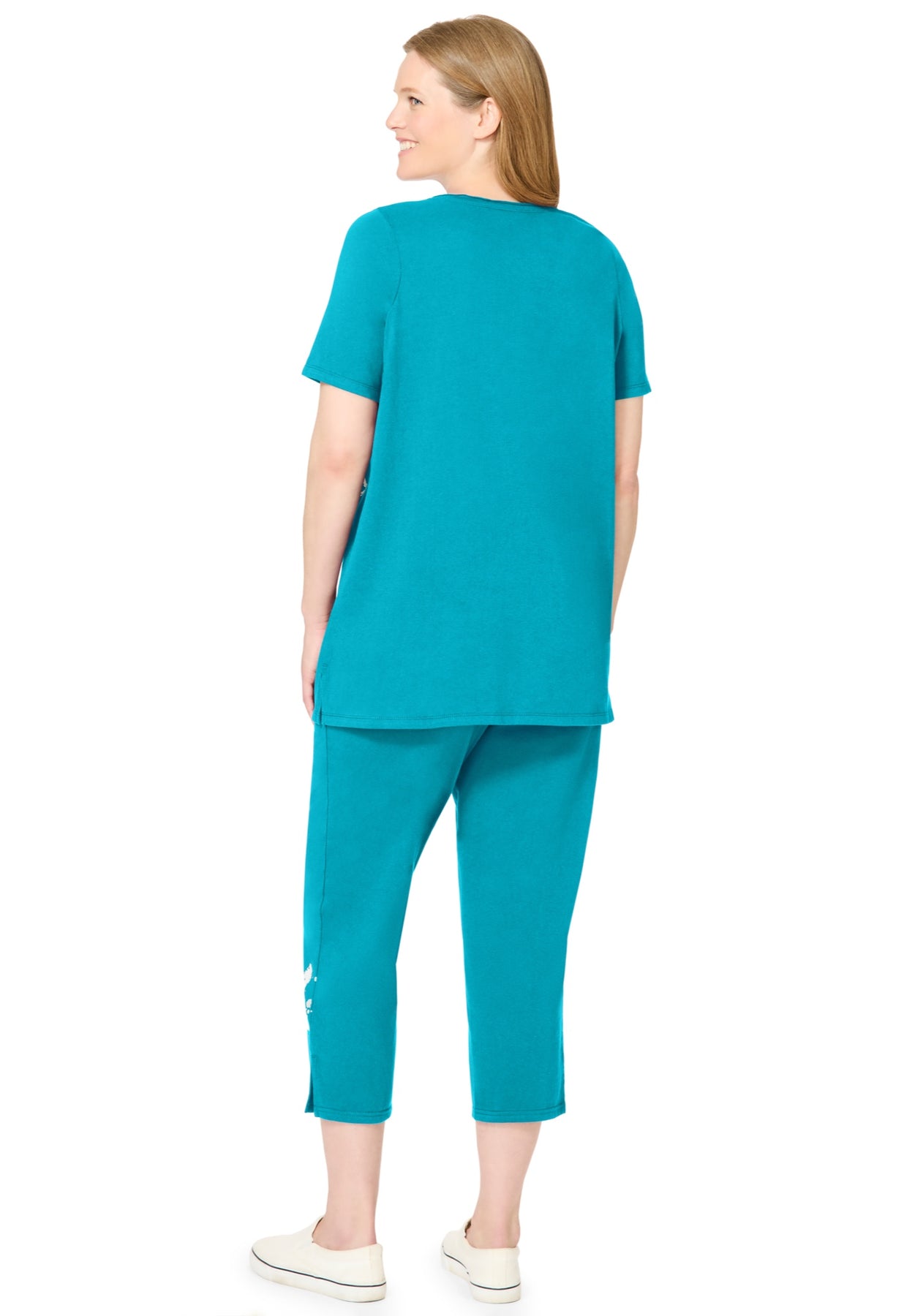 - Includes a relaxed V-neck tee and comfortable capri pants.