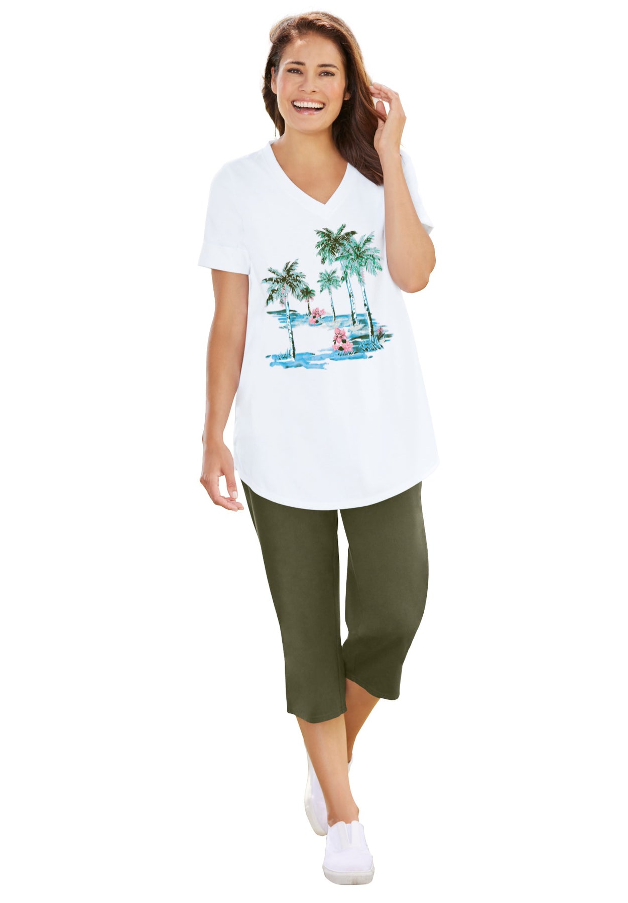 - Coordinating solid capri pants that complement the tunic perfectly.