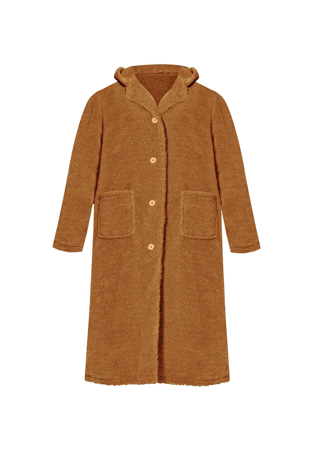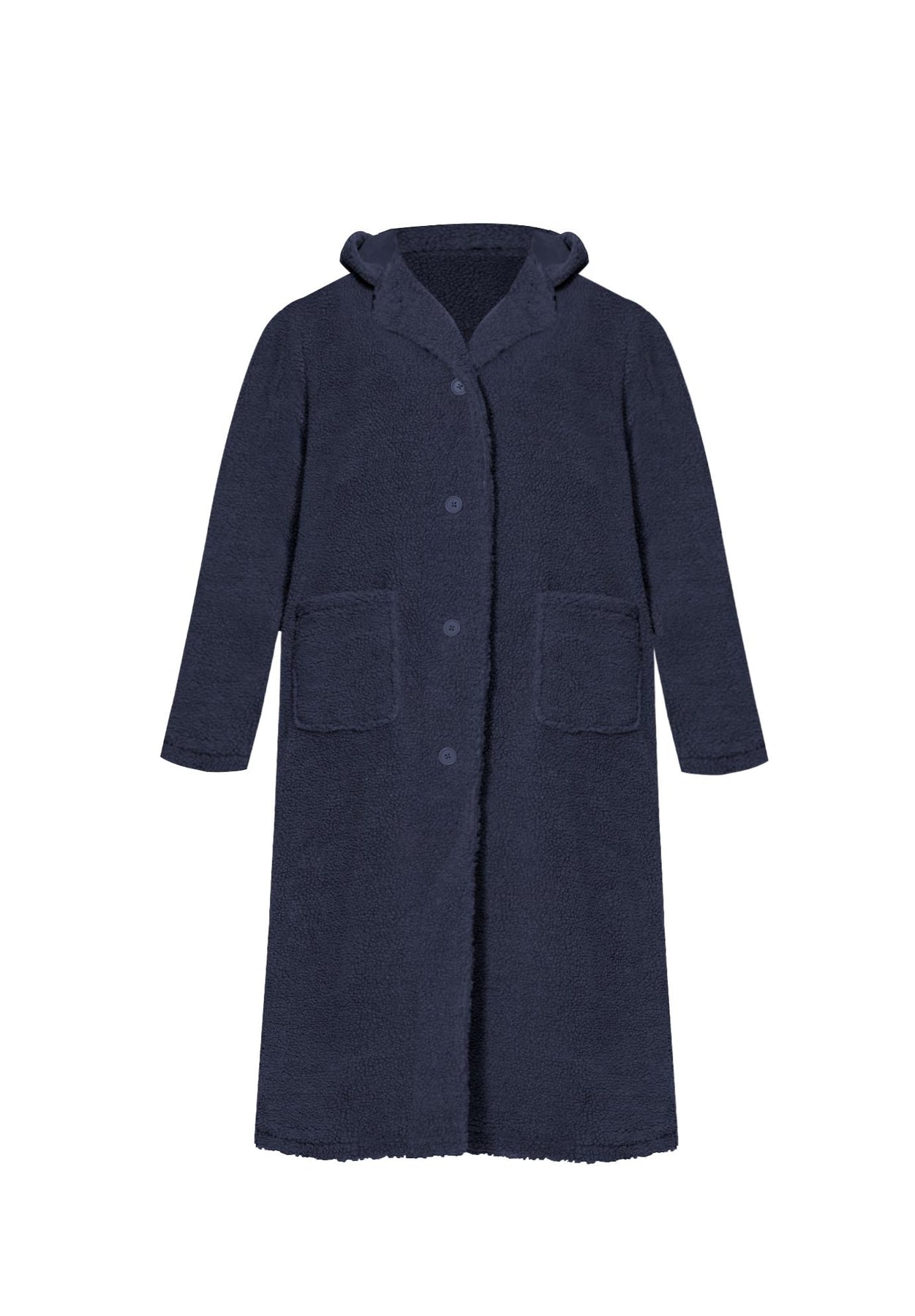 The soft texture of this extra-long fleece coat will keep you warm and cozy throughout the colder months. A button front and attached hood keep you nice and snug while front patch pockets keep your hands warm. Cuddle up in this teddy bear coat that layers perfectly over everything.