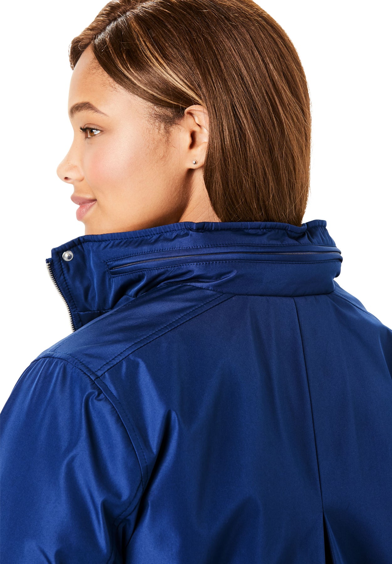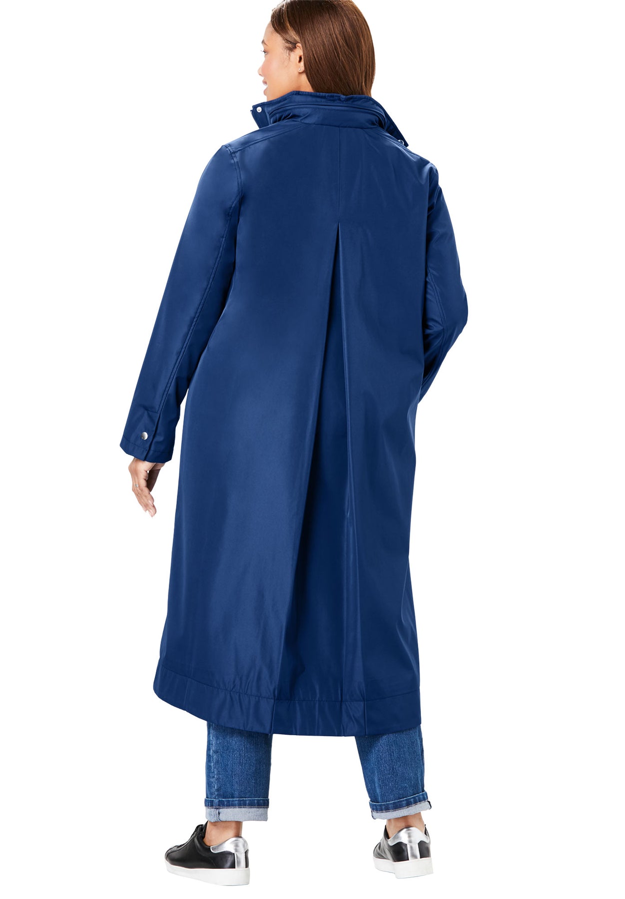 The long length of this lightweight raincoat is sure to keep you dry when the weather gets wet. Made in a relaxed fit that will layer over any outfit, a funnel collar contains a hidden hood that can be worn up or stowed away. Designed with a zippered front with snap placket.