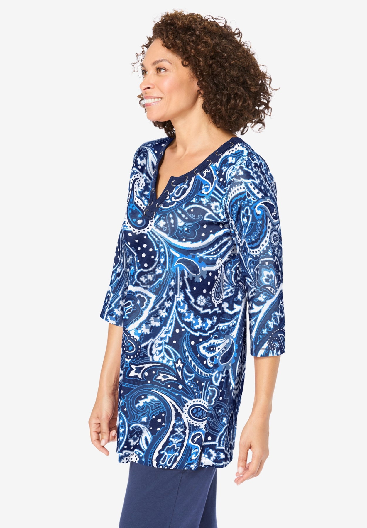 Great for every season, this three-quarter sleeve tunic has pretty lace details inside grommets with a split scoop neck. Body is printed on select colors, trim. 4" side slits. Straight hem.