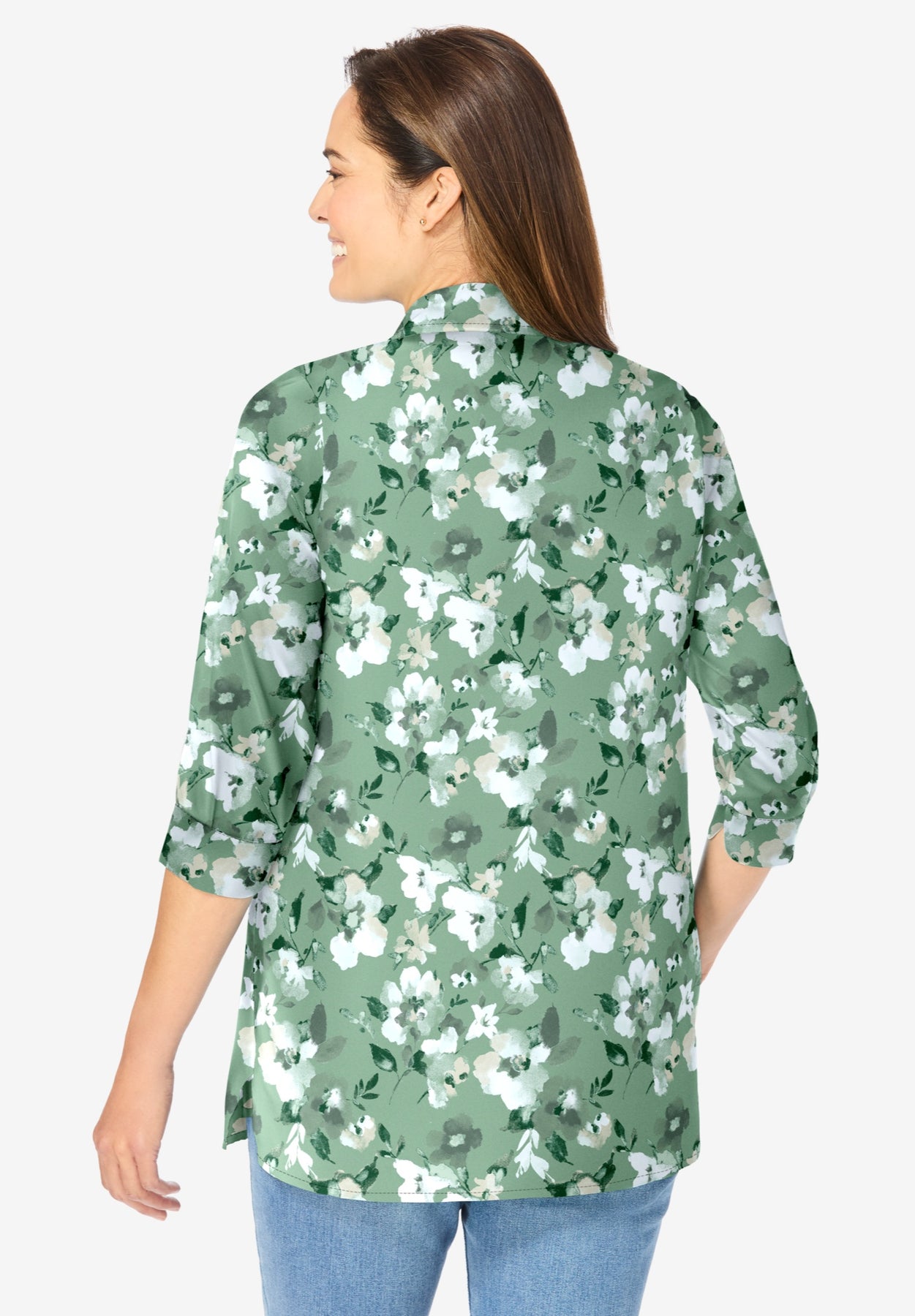 This tunic is specially treated giving it an extra soft finish. Beautiful shirt with collar, button front and three-quarter sleeves. Side slits on shirt and straight hem. Tank has scoop neckline and straight body and hem.