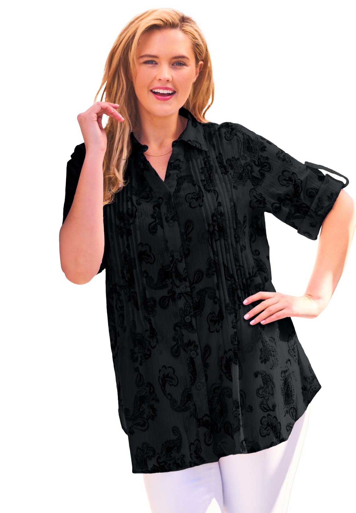 - Rolled sleeves with button tab offer versatile styling options for a casual or relaxed look.