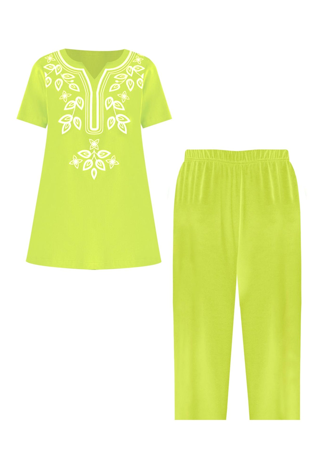 This vibrant set is summer dressing at its best. This set consists of a split v-neck tunic and elastic waist capris. Relaxed, comfortable, and fun!