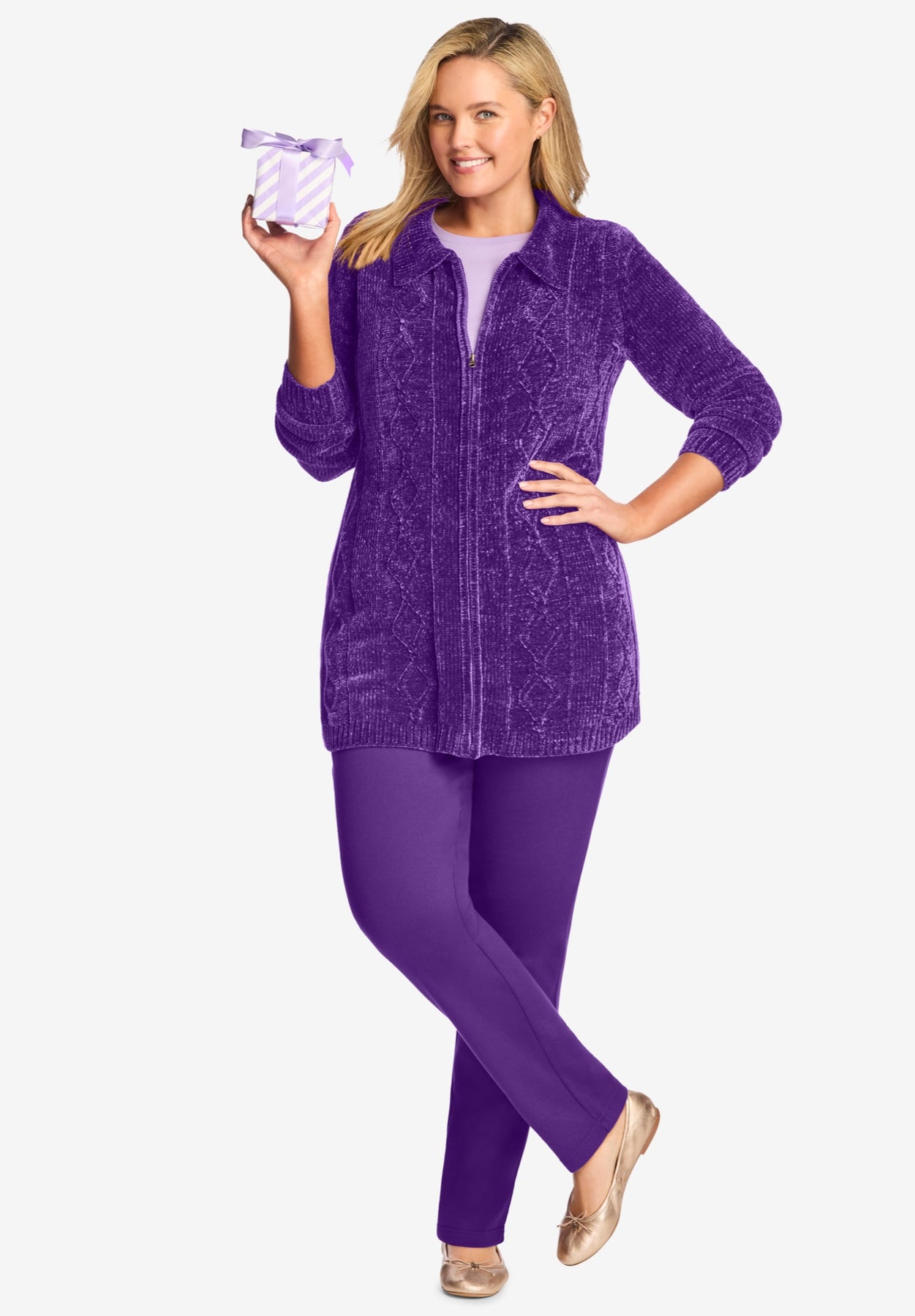 A cable version in cozy chenille! Who could ask for anything more! The zip front and ribbed collar give it classic style.